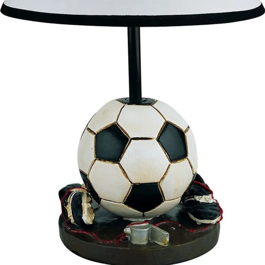 With this Soccer Themed Table Lamp you can add whimsical design and brightness to your kids' or games room instantly. The base of the lamp is made of metal and is in a round shape. On top of this base, there are a soccer ball, two soccer shoes, and a whistle. These details are colored in traditional colors with the soccer ball in a white and black colorway, the shoes in a blue and white colorway, and the whistle in a red and silver colorway. The white fabric shade has black top and bottom edges and completes the look of this lamp. This lamp is unique and fun and will elevate the look of the whole room easily. 15" H x 10" W x 10" D