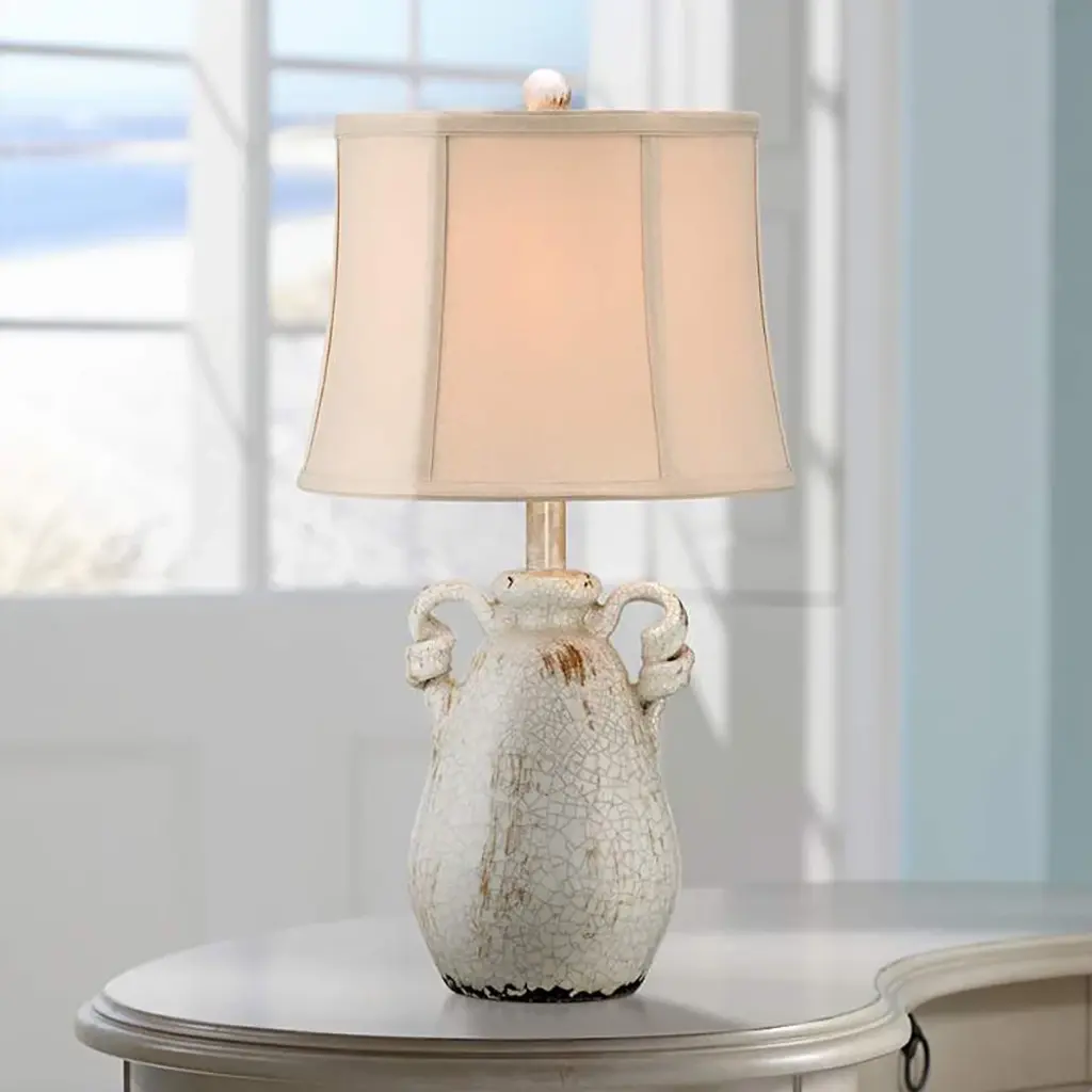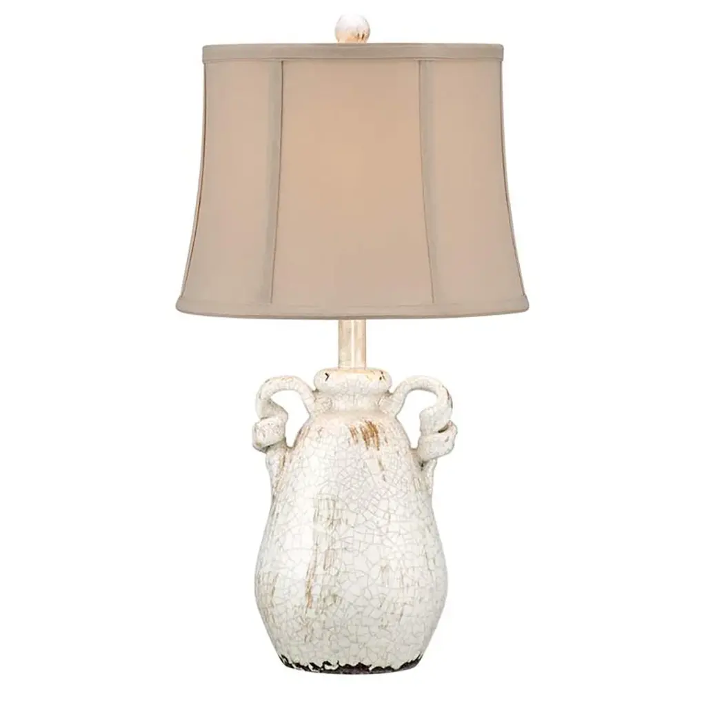 Product Details 22" high overall. Base is 8 1/2" wide in the middle x 6" wide at the bottom. Shade is 10" across the top x 12" across the bottom x 9 1/4" high. Uses one 100 watt standard-medium base bulb (not included). On-off switch on socket. A charming look for rustic farmhouse or country cottage style rooms. Jar-shaped lamp base in a crackled farmhouse ivory glaze finish. Ceramic handles for extra visual interest. Beige bell-shaped shade with an ivory glaze finish ball finial. 8-foot long cord.