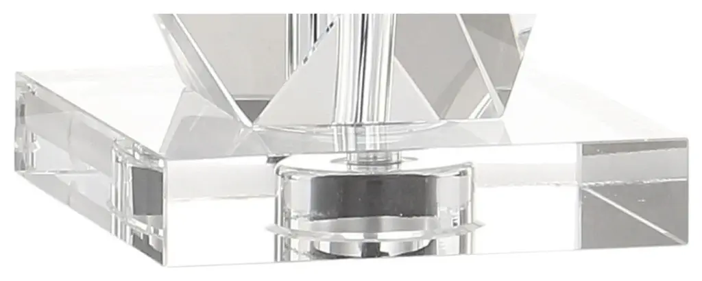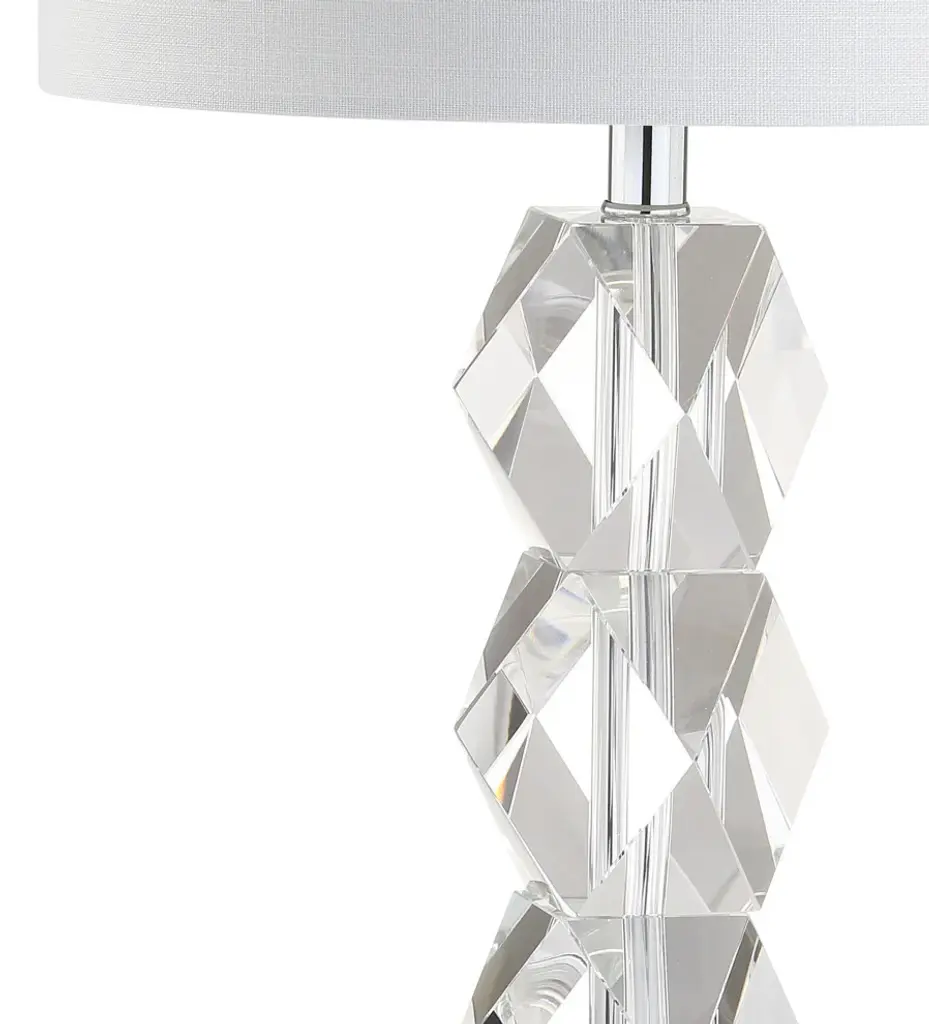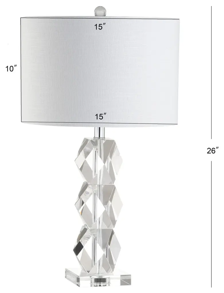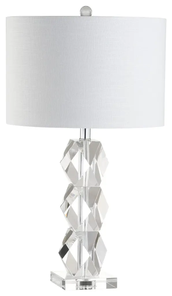This trio of crystal orbs is elegant and glamorous with the dramatic facets, adding glamour as light reflects through the clear base. Topped with a barrel shade in white cotton fabric and finished with a silk-wrapped cord, the styling opportunities are endless for this versatile piece. On top of its gorgeous design, this lamp is fabricated from premium materials -- 100% cotton fabric, crystal, and chrome-plated electrical components -- making it a reliable choice for years to come. -Faceted crystal column table lamp-Classic white barrel shade in a hardback cotton material-60" silk cord with standard USA 2-prong plug -On-off switch on socket-Takes one maximum 100 watt or equivalent bulb-Eco-friendly 9W LED bulb included-UL Listed-Color: Clear with white shade-Body Material: Crystal; Iron-Base Material: Crystal-Finial Material: Crystal-Finial Color: Clear-Harp Color: Silver-Includes: One (1) lamp(s)-Minor Assembly Required-Lamp: 26 inches high x 15 inches wide x 15 inches deep-Shade: 10 inches high x 15 inches wide x 15 inches deepYou see a lamp.We see a decorative work of art.A perfectly curved shade casts a dramatic shadow on a floor. A silk cord you never want to hide. LED lightbulbs: as easy on the environment as they are on the eyes. The JONTHAN Y Lighting collection considers every detail from impeccably sourced materials to designer styling. And our prices are so attractive, we''ve transformed a functional necessity into a fashion accessory.JONATHAN Y Lighting - a fashion revolution in home decor.
