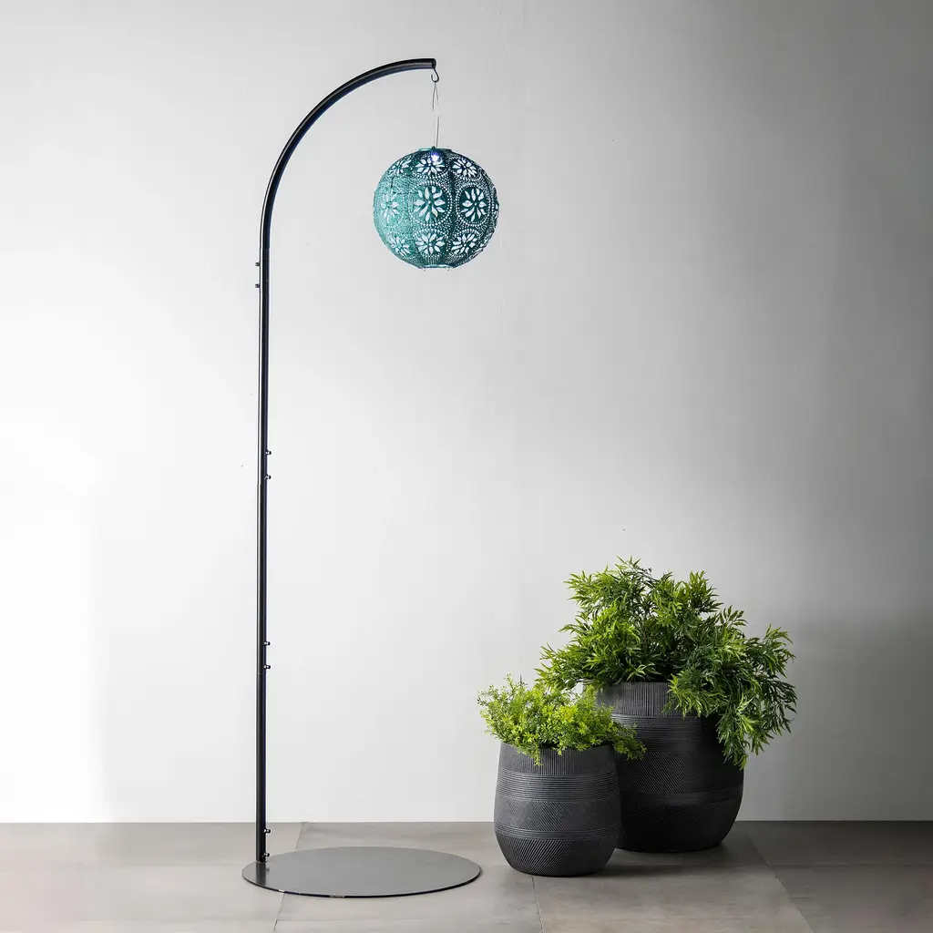 This black metal cantilevered stand can hold outdoor lanterns to cast beautifully patterned shadows in your outdoor space. Pair it with our solar lamps for a place-anywhere lighting feature. Our sturdy metal standing lantern hook has an appealing dark iron finish that coordinates with most of our unique hanging lanterns. The round base allows you to place our outdoor hook on cement or wooden decks, no lawn required. Place multiple garden hooks around your yard or patio and hang assorted lanterns or small plants to create a dazzling effect at night. Holds up to 25 lbs.