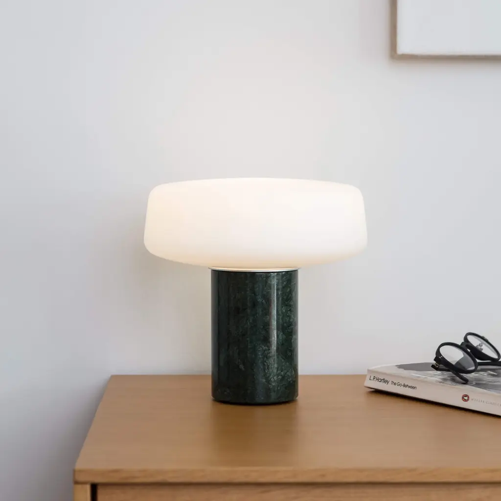 Solid's cylindrical base, crafted from finely polished marble, extends the collection to desktop or table, from Case. In a selection of marble varieties—making each lamp unique, as marble is a natural material and the hue and veining vary from piece to piece. Topped by an opal glass shade which is hand-blown and then acid-etched inside and out to provide a soft, diffused light from the integrated and fully dimmable LED, all controlled by a touch button on the marble base.