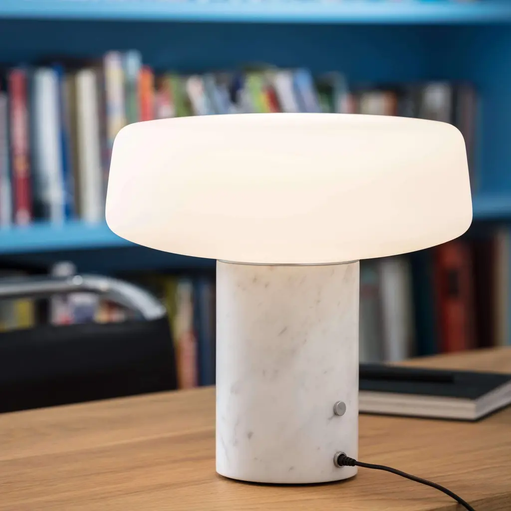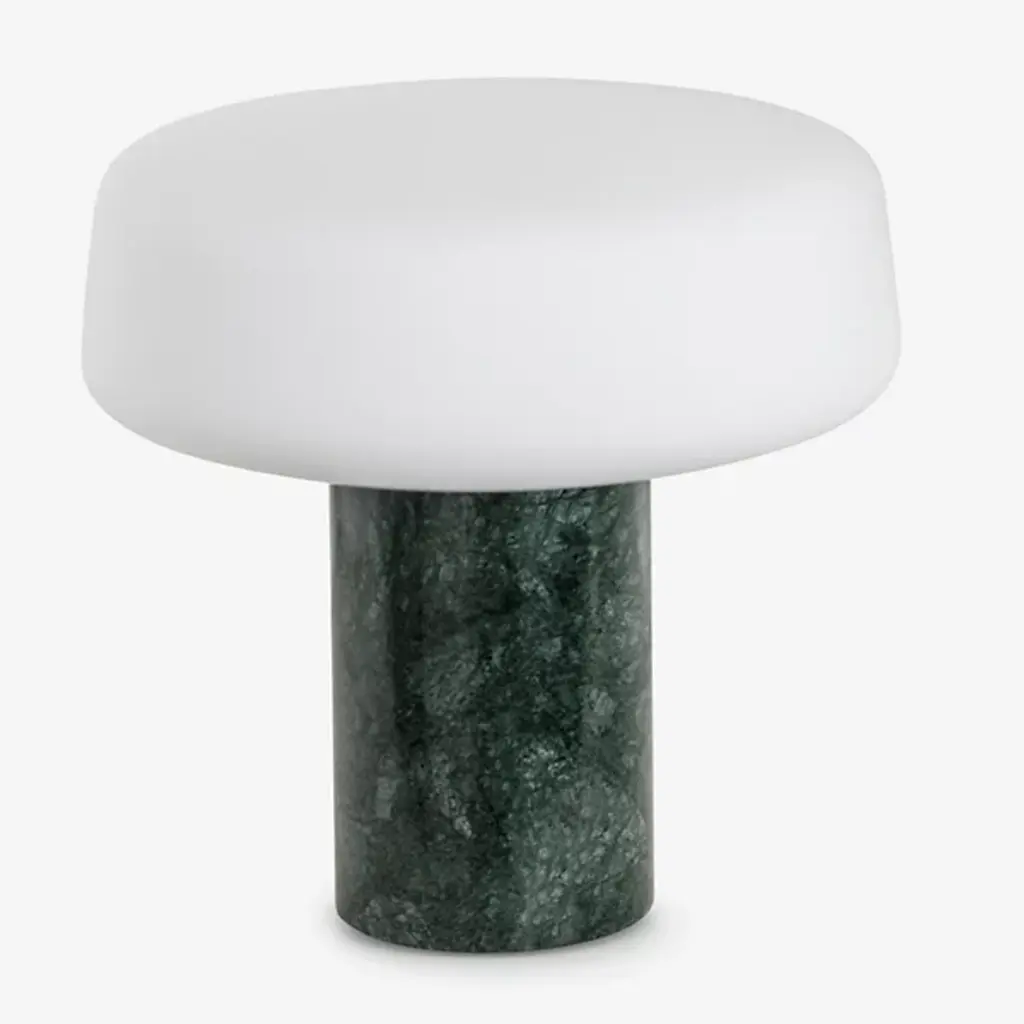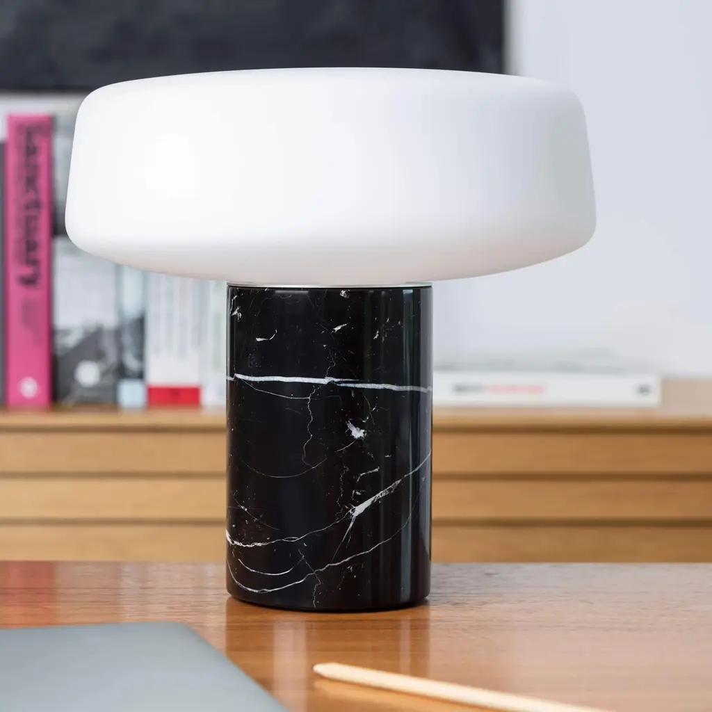 Solid's cylindrical base, crafted from finely polished marble, extends the collection to desktop or table, from Case. In a selection of marble varieties—making each lamp unique, as marble is a natural material and the hue and veining vary from piece to piece. Topped by an opal glass shade which is hand-blown and then acid-etched inside and out to provide a soft, diffused light from the integrated and fully dimmable LED, all controlled by a touch button on the marble base.
