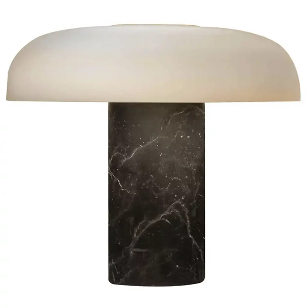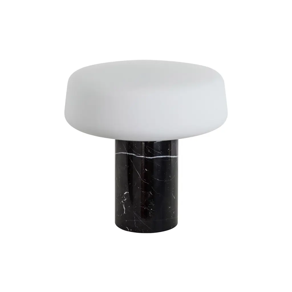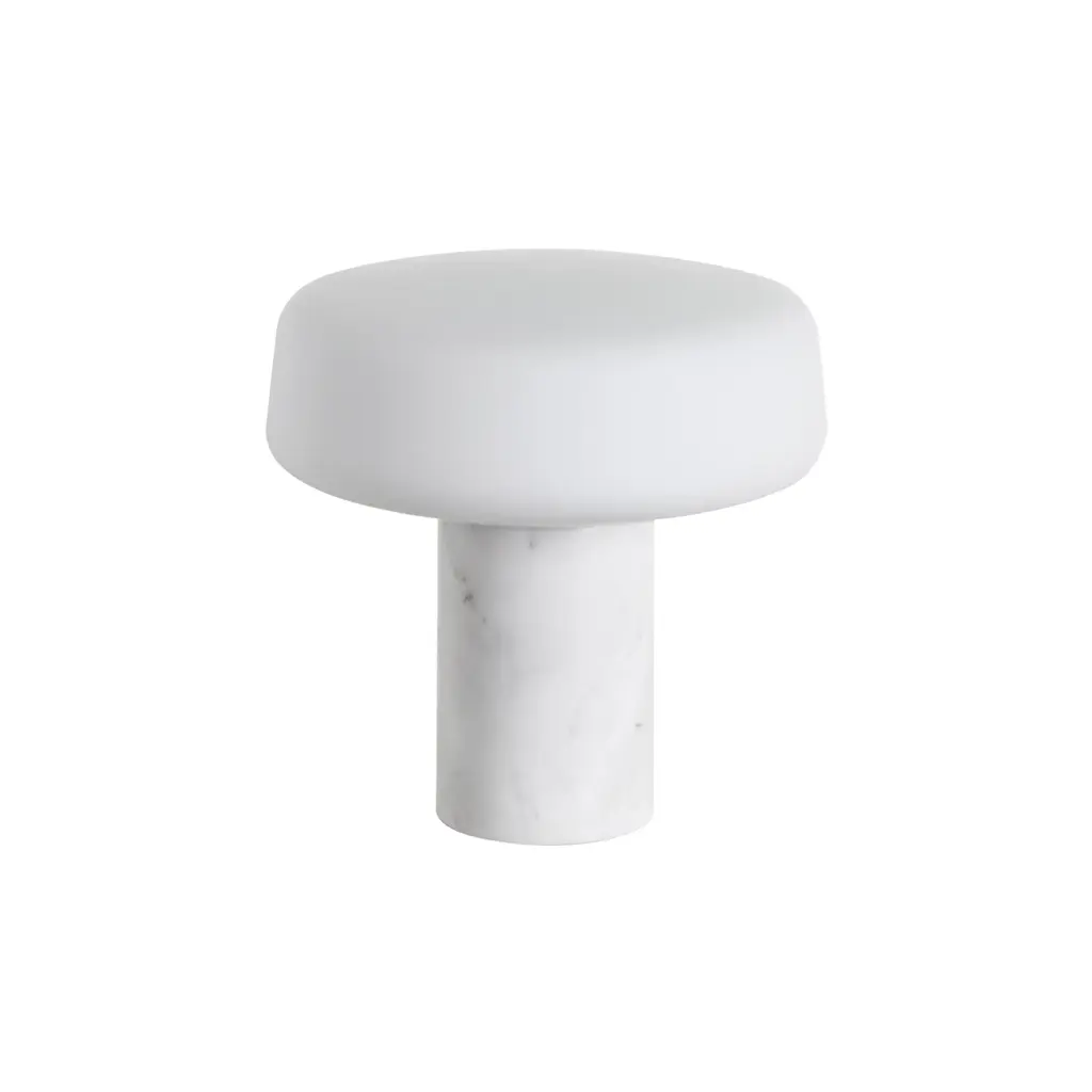 Solid's cylindrical base, crafted from finely polished marble, extends the collection to desktop or table, from Case. In a selection of marble varieties—making each lamp unique, as marble is a natural material and the hue and veining vary from piece to piece. Topped by an opal glass shade which is hand-blown and then acid-etched inside and out to provide a soft, diffused light from the integrated and fully dimmable LED, all controlled by a touch button on the marble base.