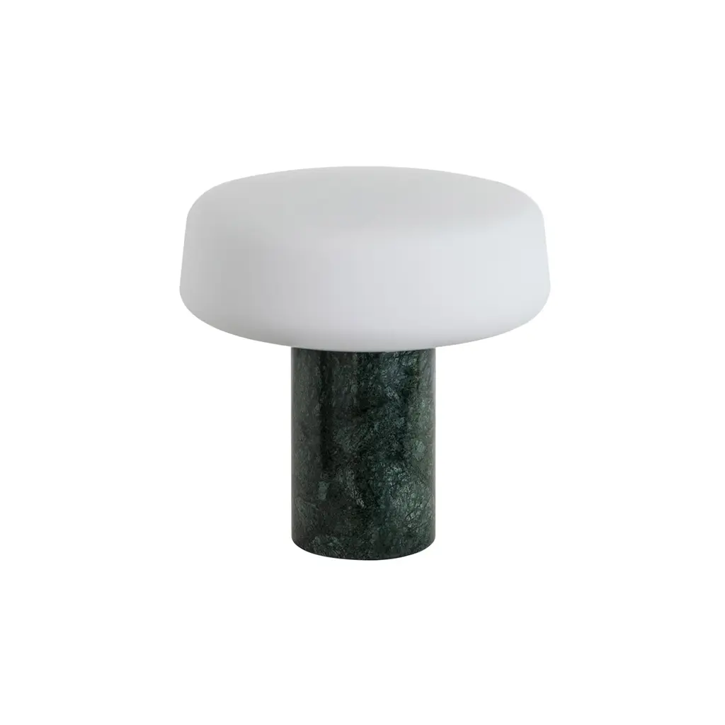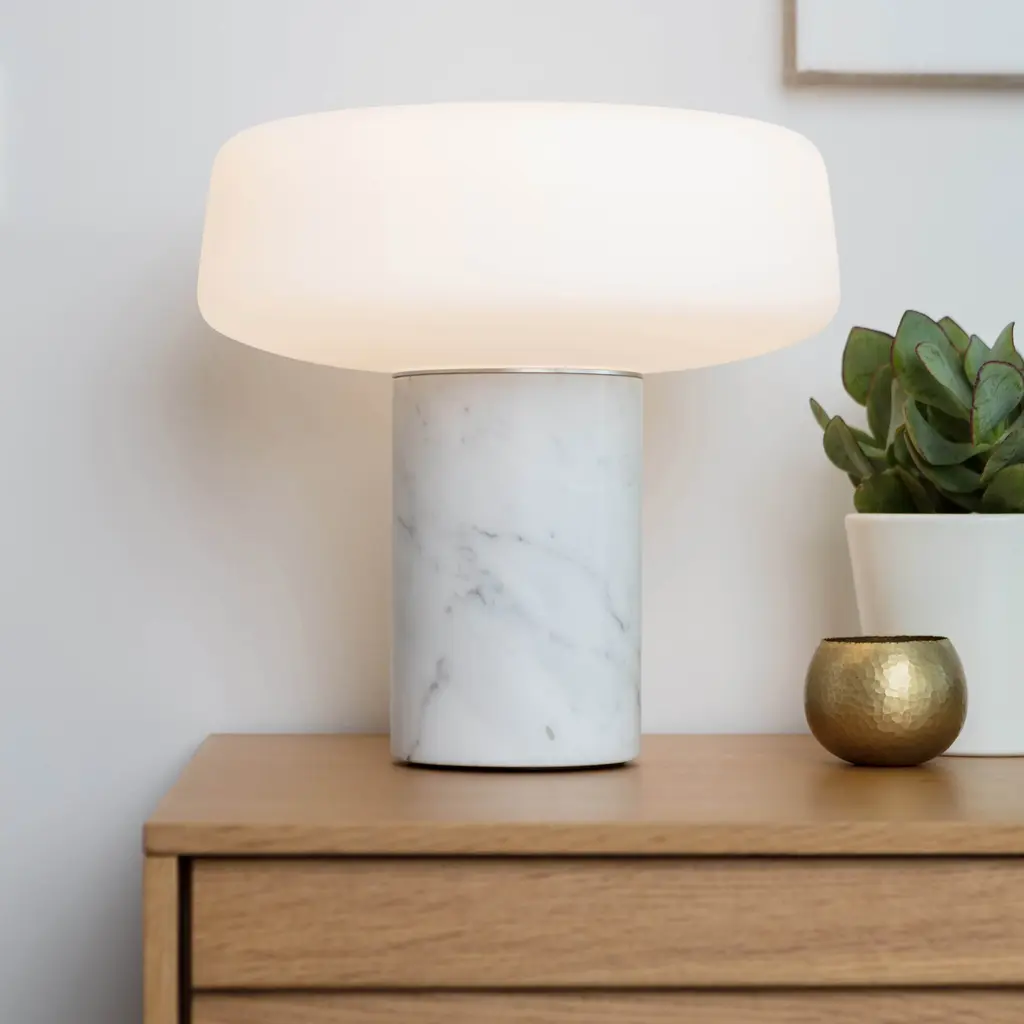 Solid's cylindrical base, crafted from finely polished marble, extends the collection to desktop or table, from Case. In a selection of marble varieties—making each lamp unique, as marble is a natural material and the hue and veining vary from piece to piece. Topped by an opal glass shade which is hand-blown and then acid-etched inside and out to provide a soft, diffused light from the integrated and fully dimmable LED, all controlled by a touch button on the marble base.