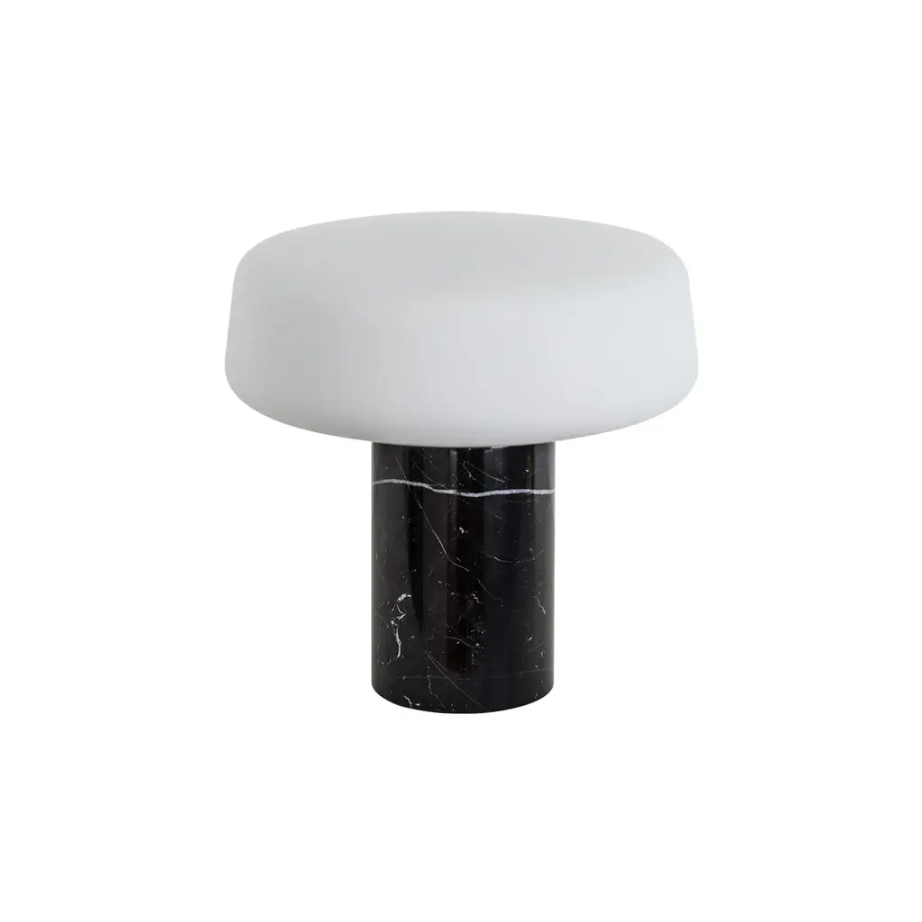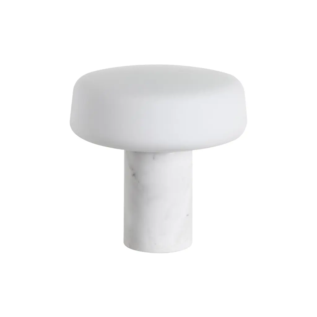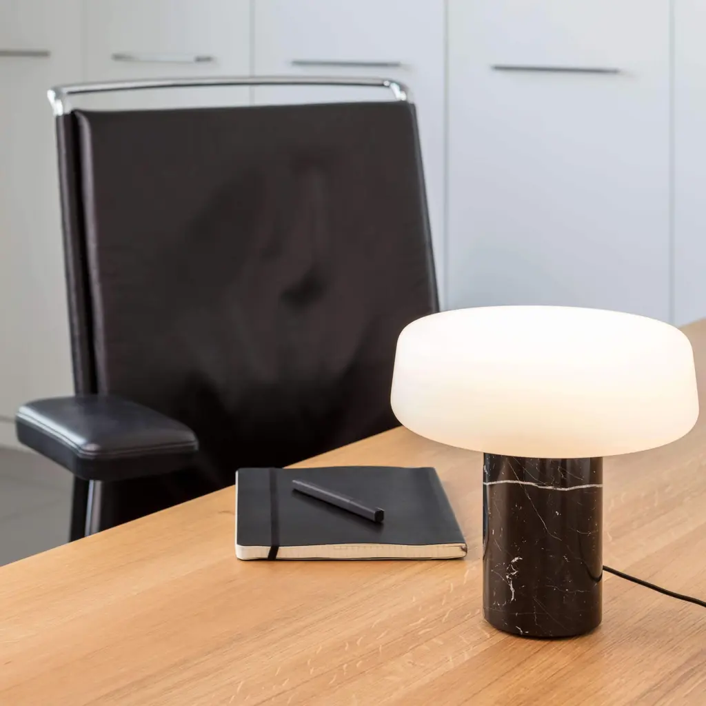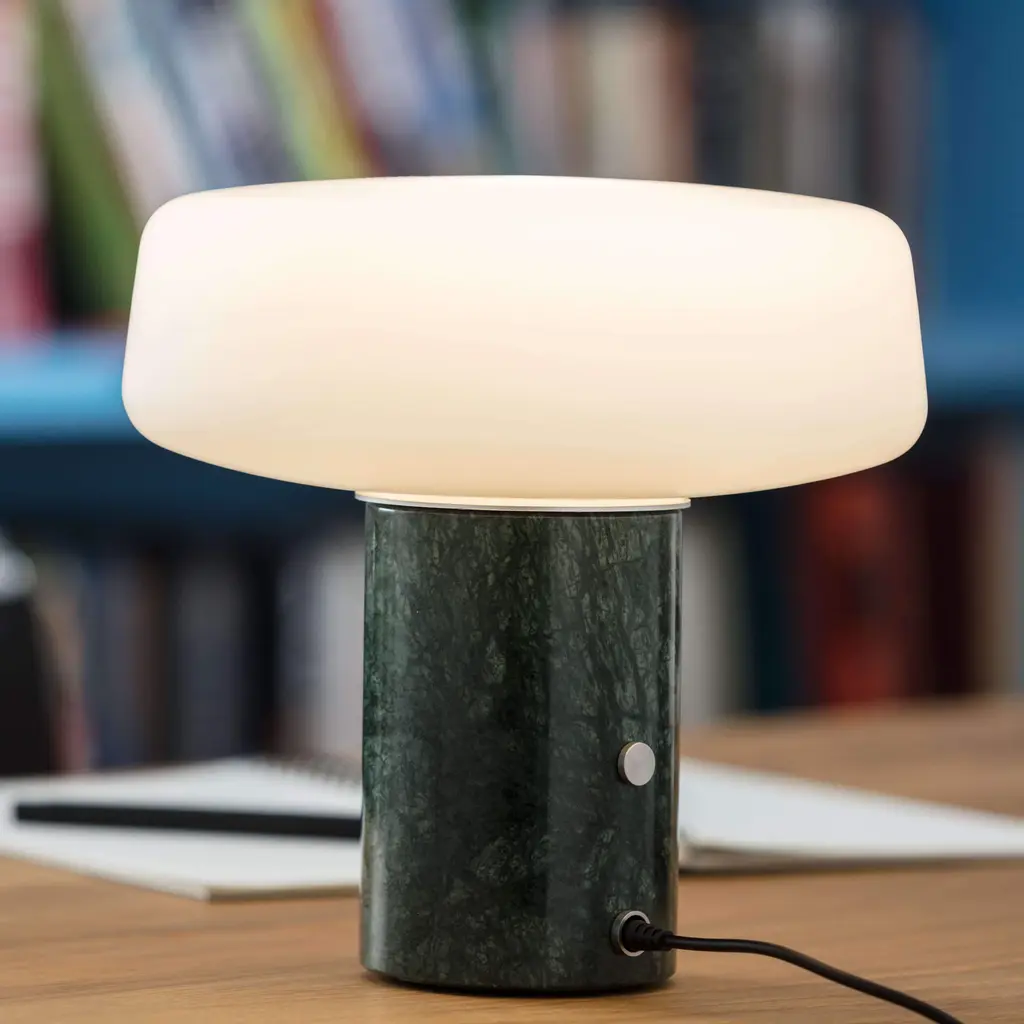 Solid's cylindrical base, crafted from finely polished marble, extends the collection to desktop or table, from Case. In a selection of marble varieties—making each lamp unique, as marble is a natural material and the hue and veining vary from piece to piece. Topped by an opal glass shade which is hand-blown and then acid-etched inside and out to provide a soft, diffused light from the integrated and fully dimmable LED, all controlled by a touch button on the marble base.
