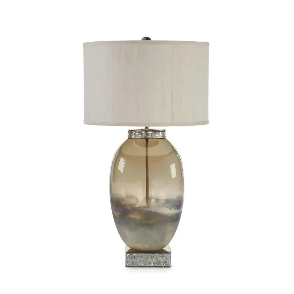 The Solomon Table Lamp is a sophisticated design statement, lending an aura of refinement to an interior space. Crafted from art glass in swirling brown tones that feature a two-toned look of solid and transparent surfaces. The piece sits atop a Polished Brass base with a shattered glass texture, matching the neck accent and ball finial. The look is completed by a drum shade with cream-toned striations.