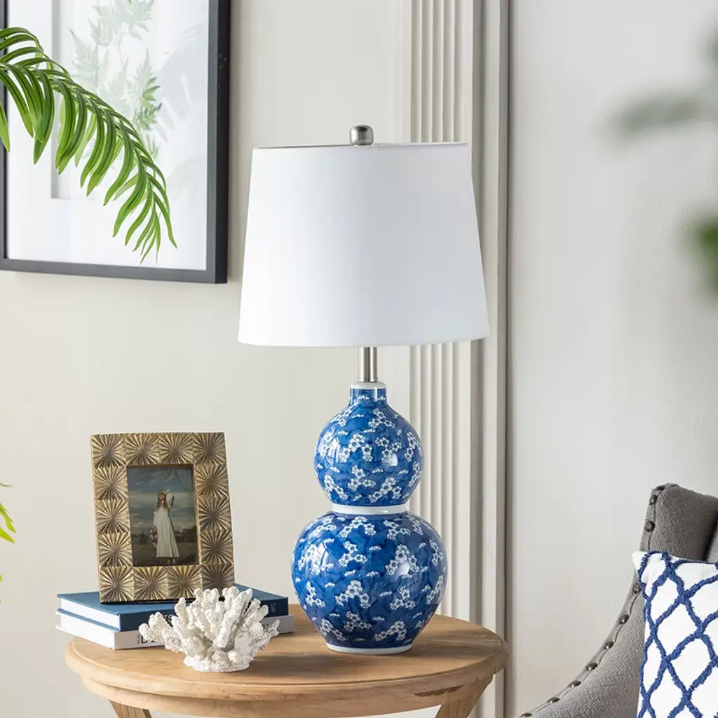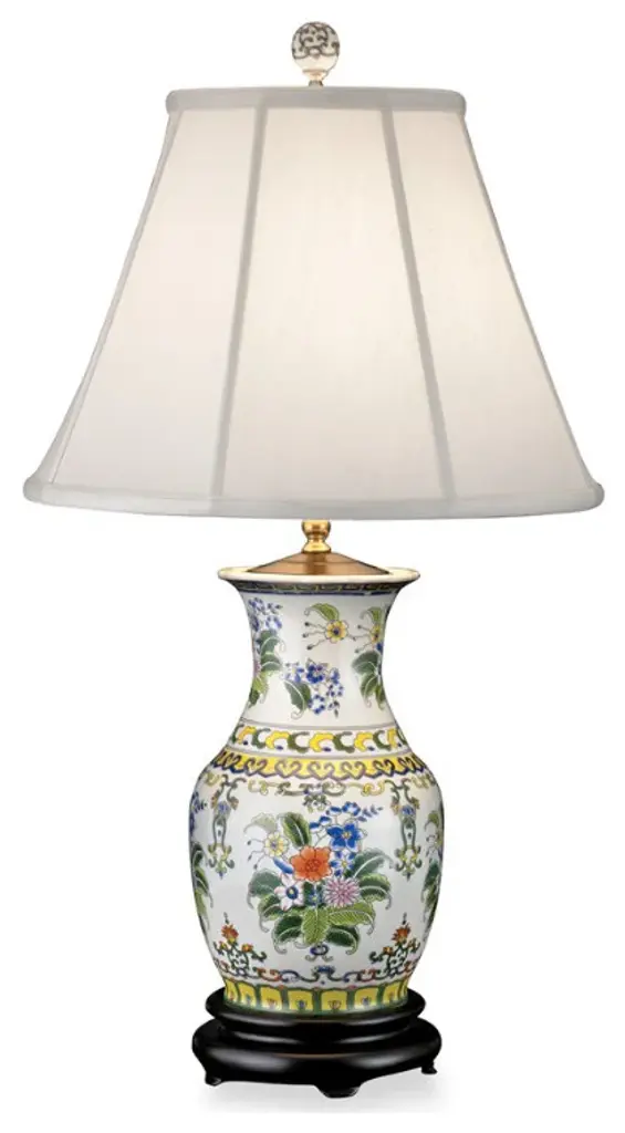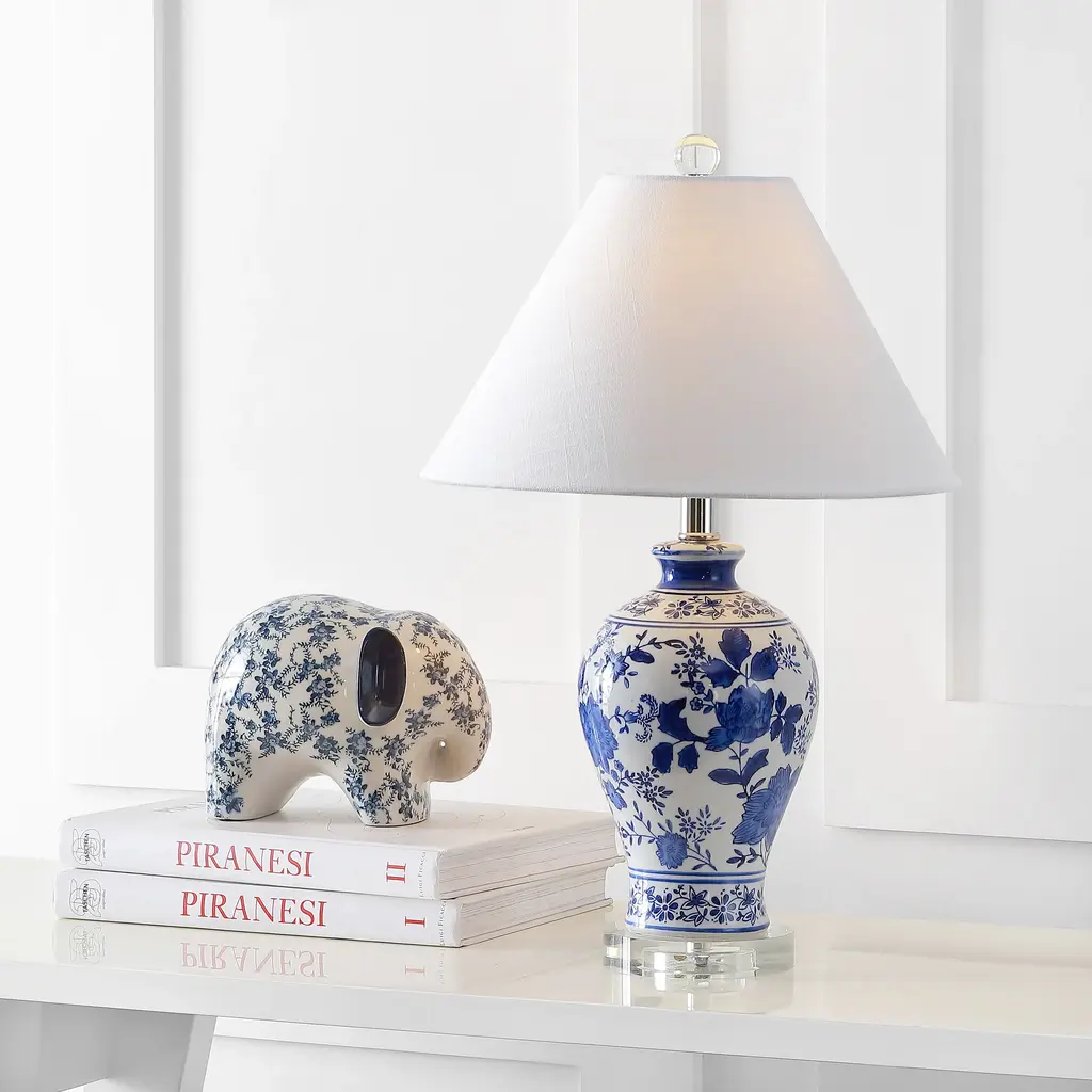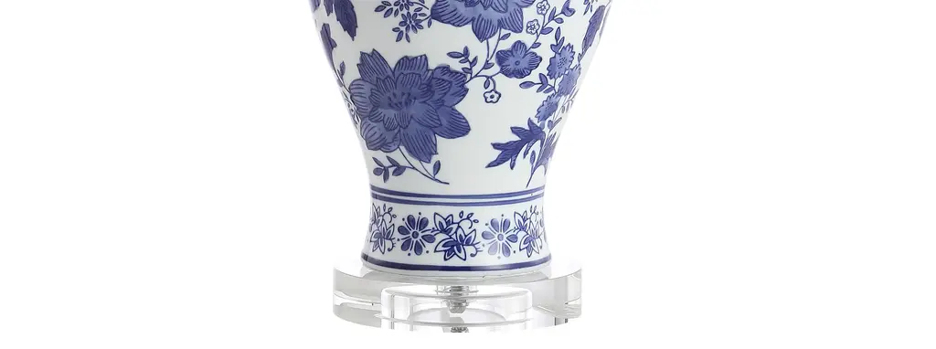 Traditional blue and white Chinese porcelain never goes out of style. Our vase-shaped lamp is decorated with a classic floral design and set on a stylish lucite base. Topped with a tapered fabric lampshade and crystal finial, this lamp makes a statement by itself, or as a pair.