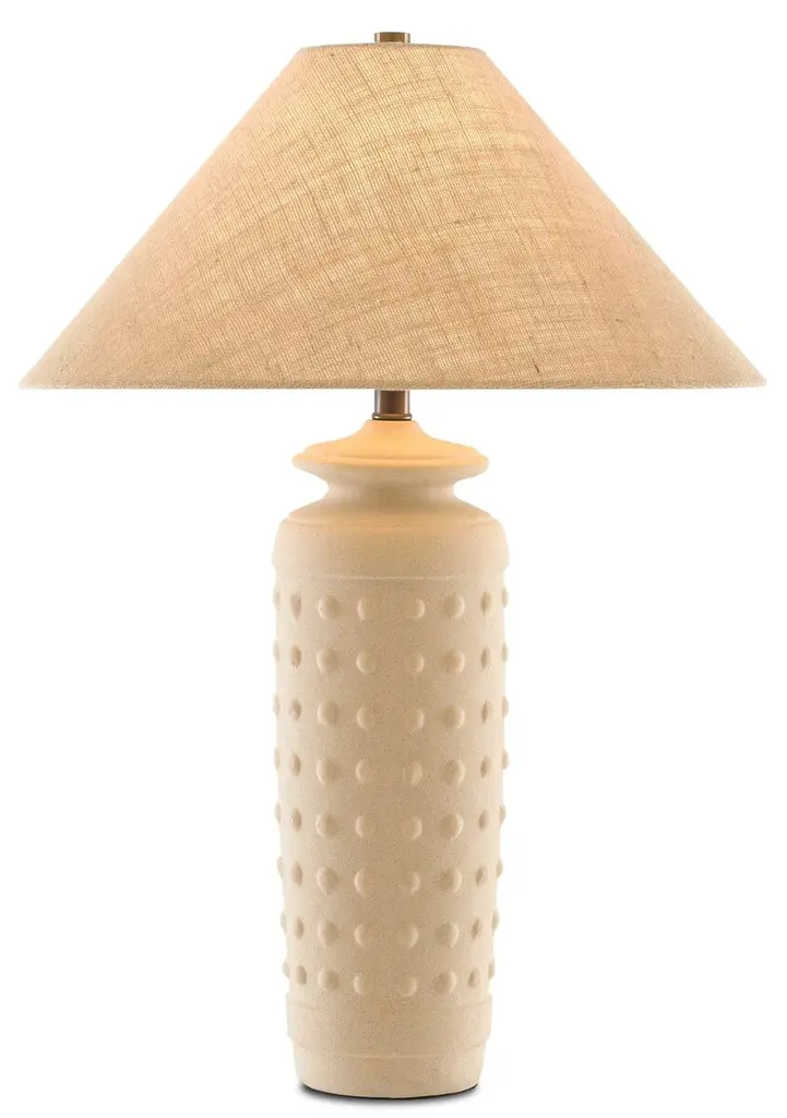 The raised dots that encircle this table lamp's ceramic body offer a textural contrast to the burlap shade. The neutral hues make this an ideal complement to just about any room.