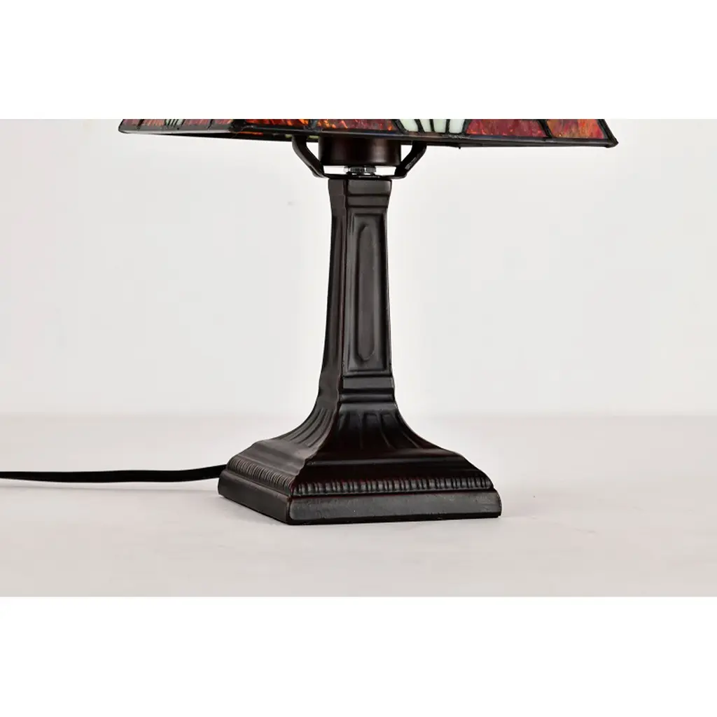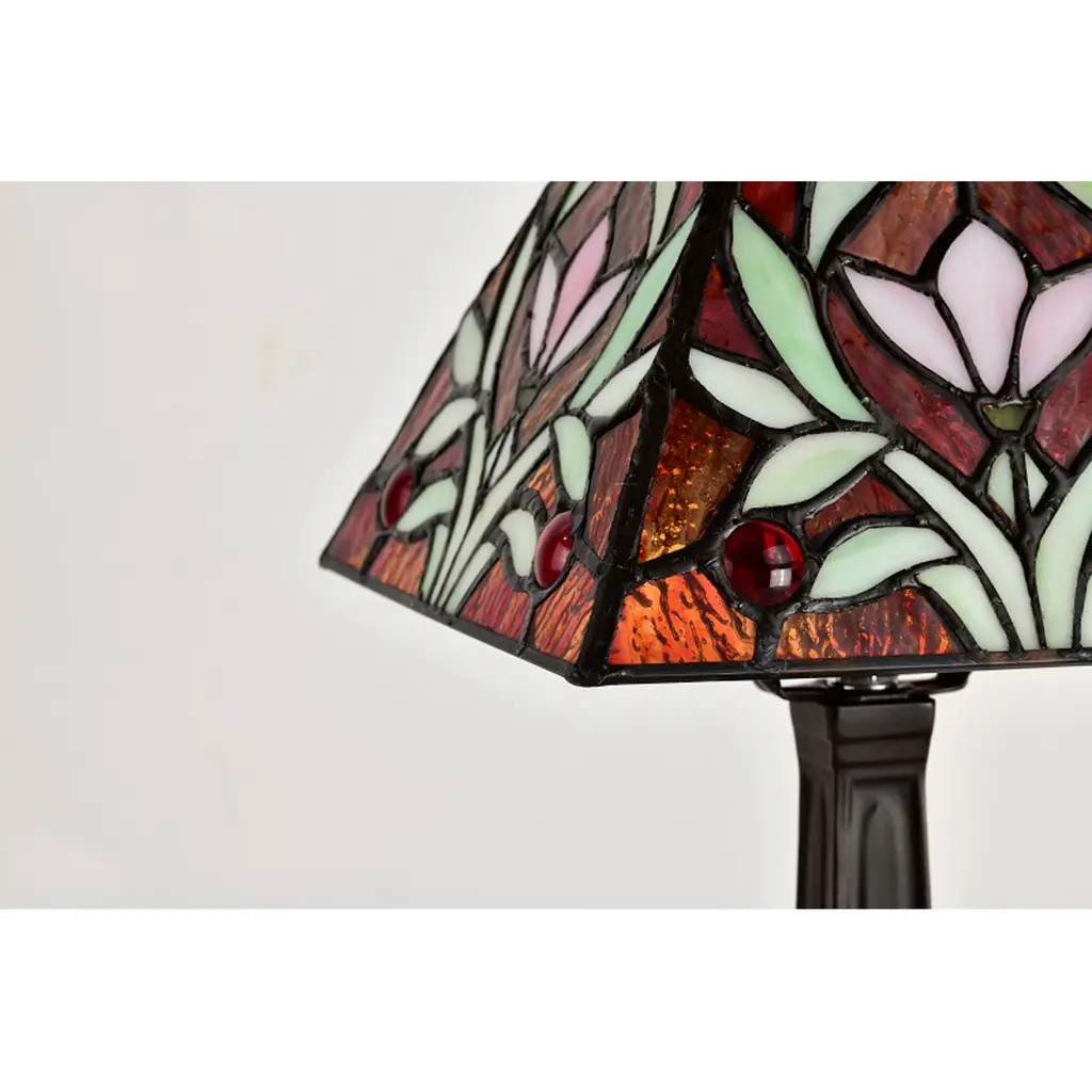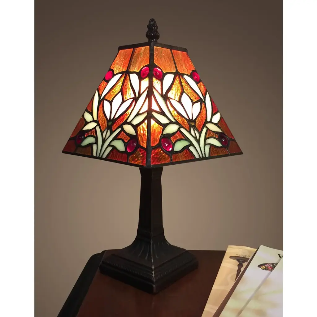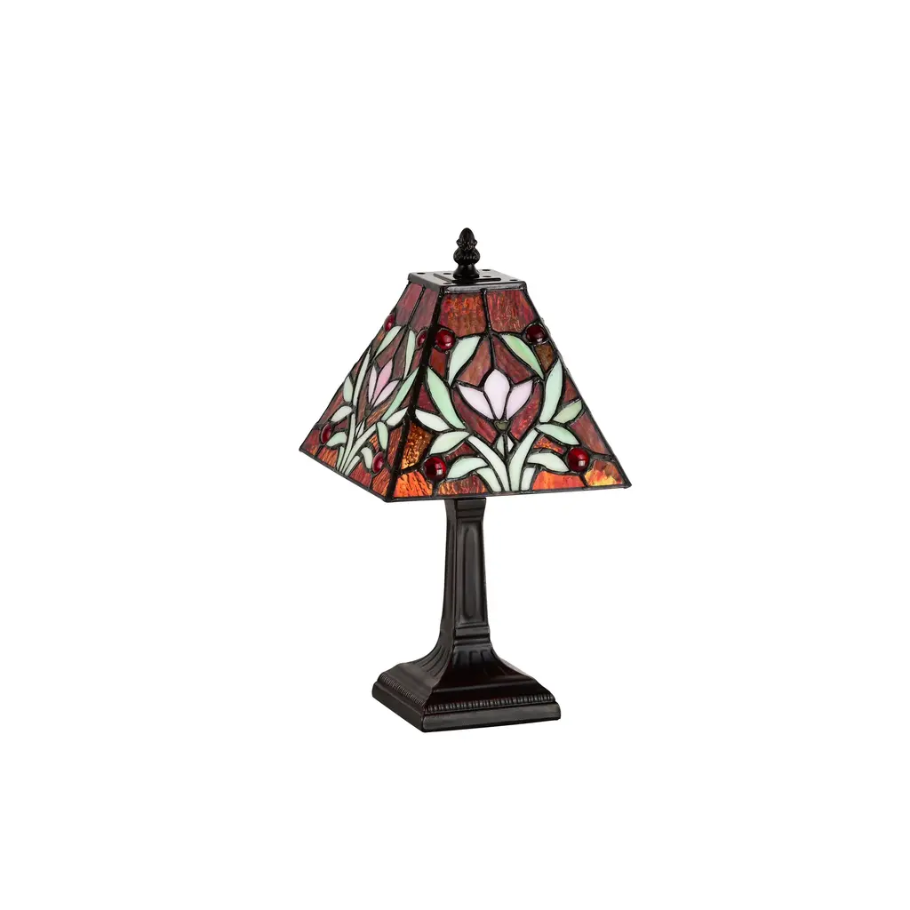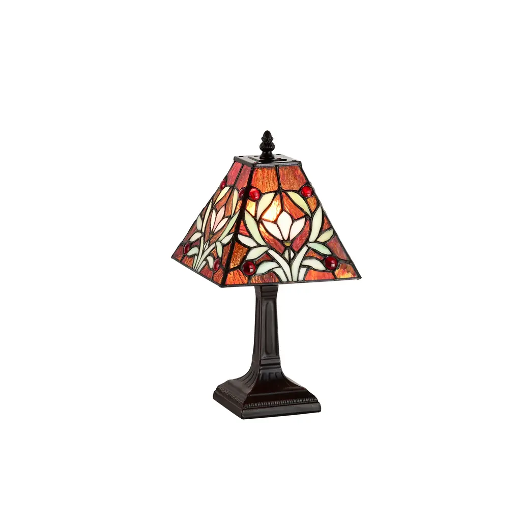 Light compact work spaces with this small Tiffany-style table lamp. Stained glass pieces are hand cut and wrapped with fine copper foil to form floral-style patterns on the shade for stunning vivid light, and this bronze-finished lamp uses a line switch to turn it on and off easily.Tiffany-styleSmall table lampIncludes approximately 45 inches of wireSetting: IndoorFixture finish: BronzeShades: Stained glassNumber of lights: One (1)Requires One (1) 60-watt bulbs (not included)Line switchDimensions: 7.5 inches diameter x 12 inches high