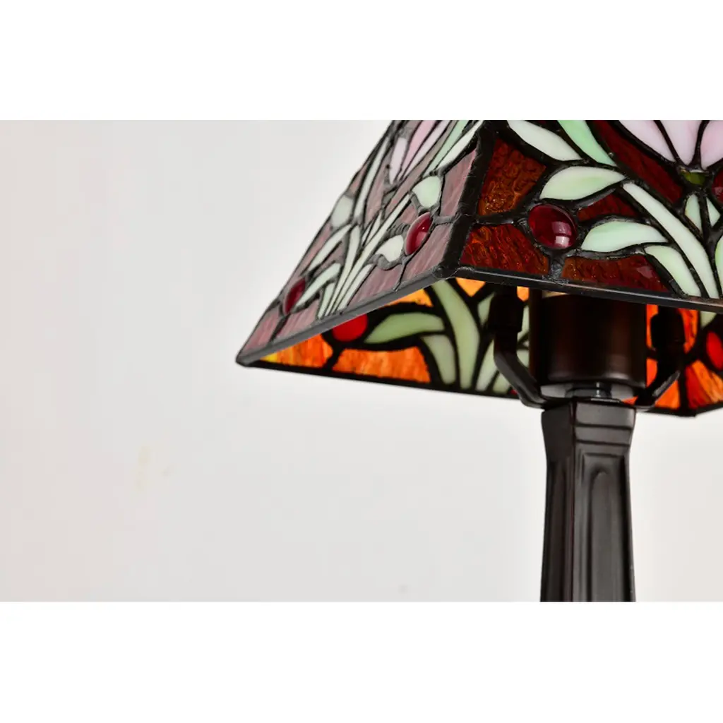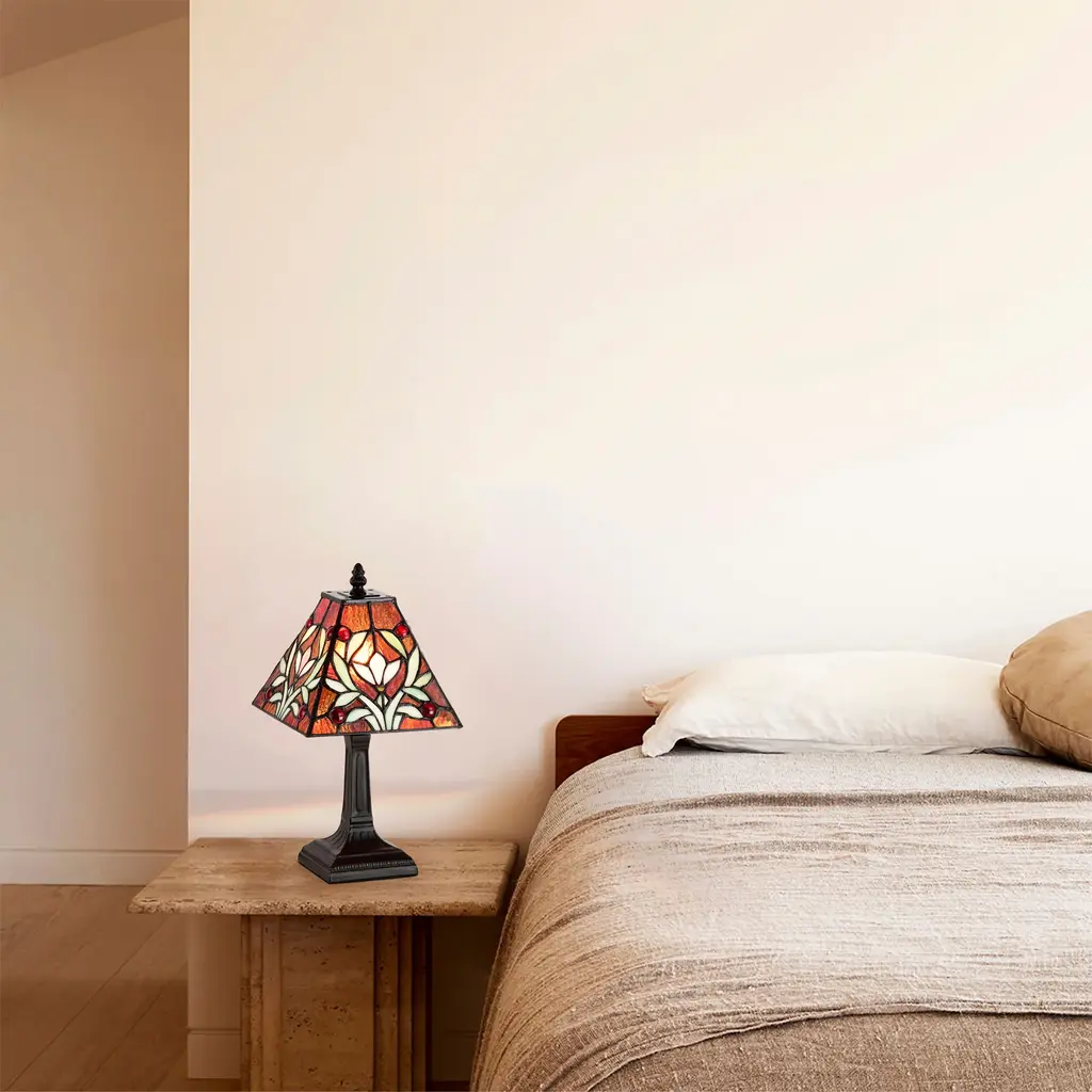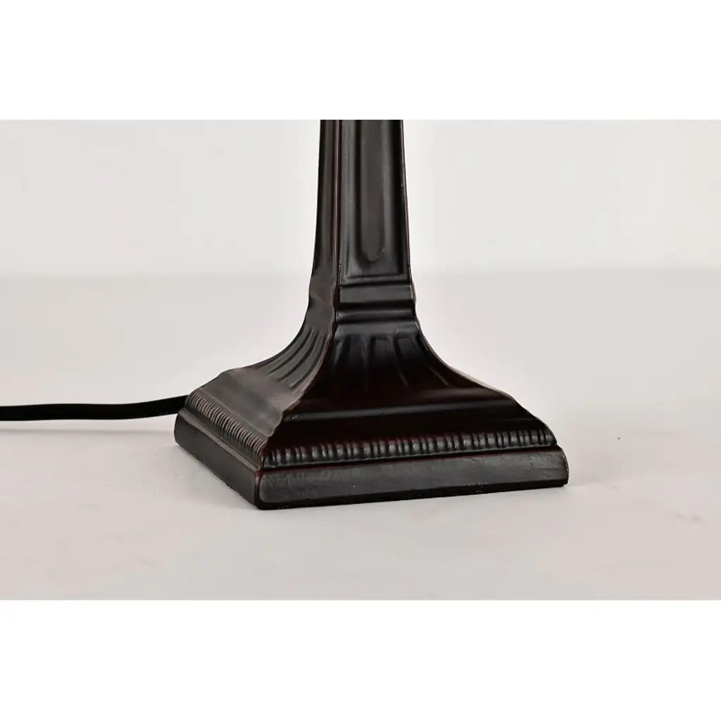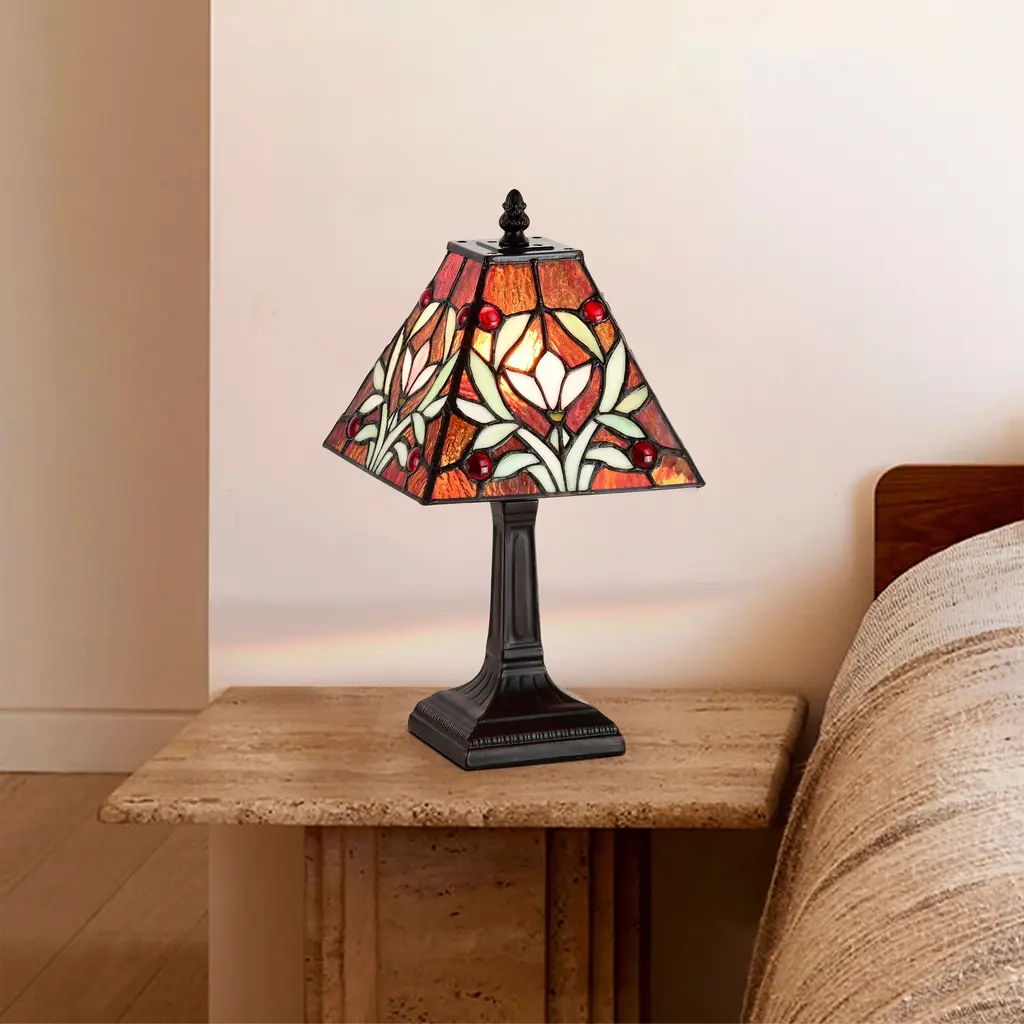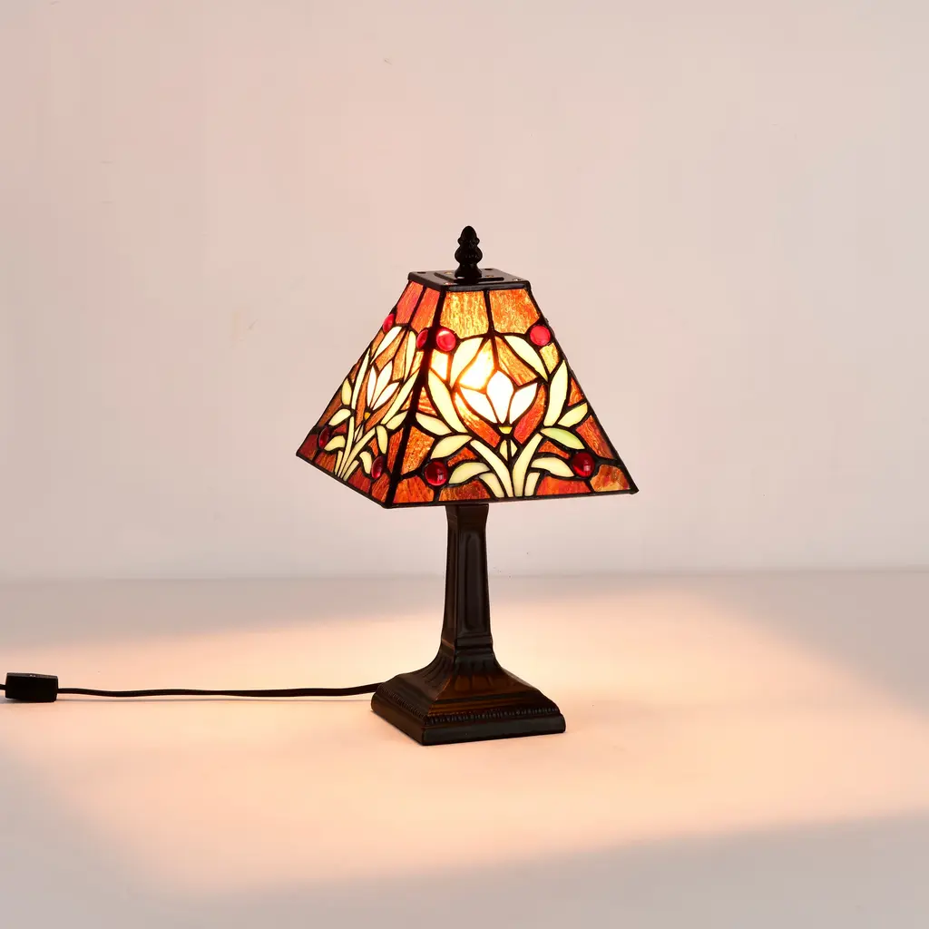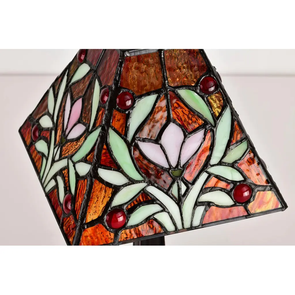 Light compact work spaces with this small Tiffany-style table lamp. Stained glass pieces are hand cut and wrapped with fine copper foil to form floral-style patterns on the shade for stunning vivid light, and this bronze-finished lamp uses a line switch to turn it on and off easily.Tiffany-styleSmall table lampIncludes approximately 45 inches of wireSetting: IndoorFixture finish: BronzeShades: Stained glassNumber of lights: One (1)Requires One (1) 60-watt bulbs (not included)Line switchDimensions: 7.5 inches diameter x 12 inches high