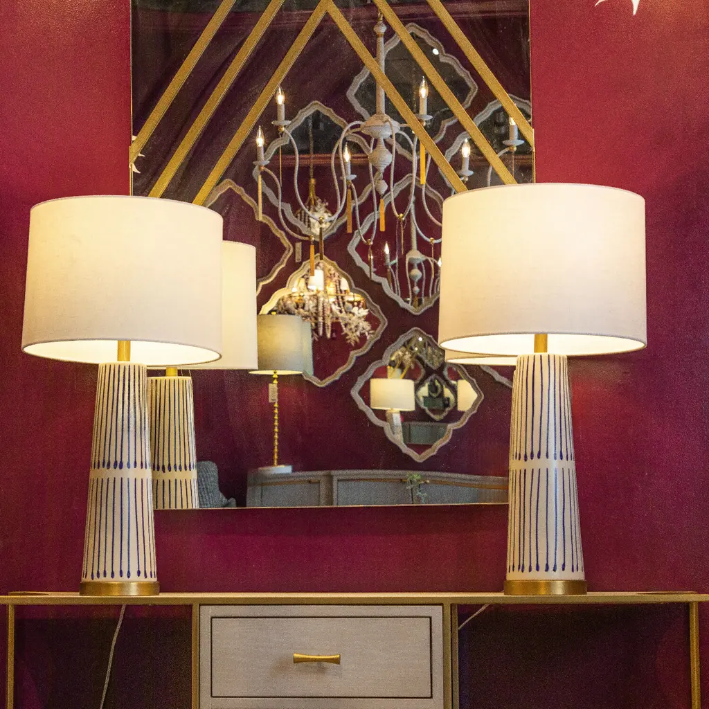 The Sophie Table Lamp showcases the chic detail of the blue hand-painted porcelain body that adds a modern twist to traditional techniques on an antique brass base. The simple pattern is created by vertical columns of thin blue lines ending in an organic paint drip effect, making each lamp elevated and one-of-a-kind. Perfect for living rooms, bedrooms, or offices, the Sophie Table Lamp enhances your decor with its sophisticated design and artistic craftsmanship.
