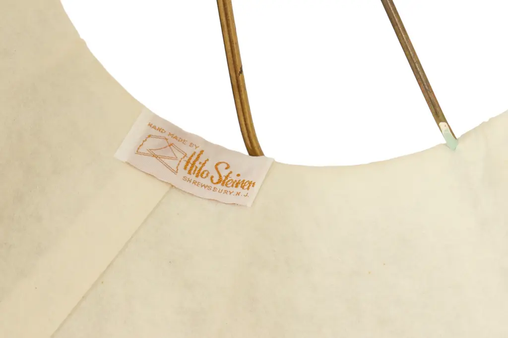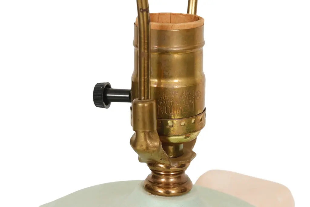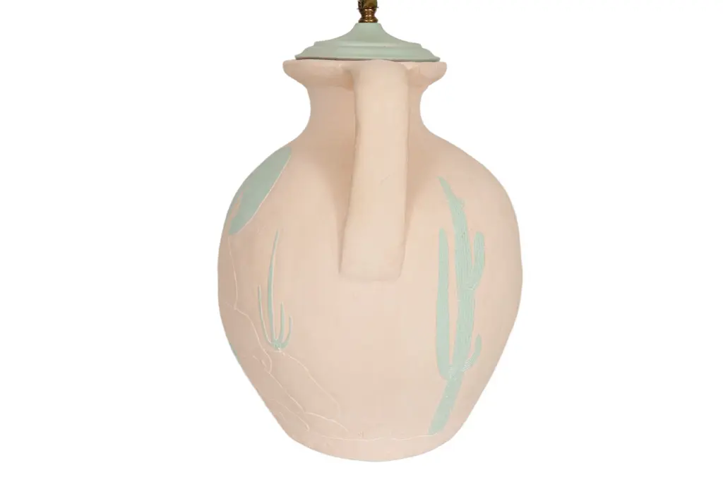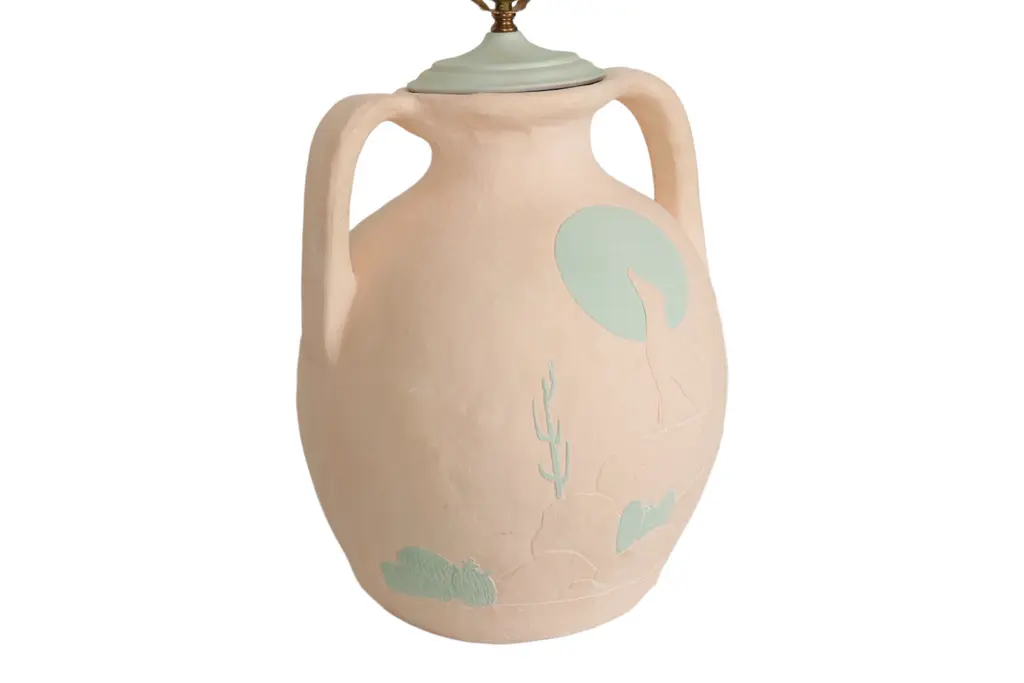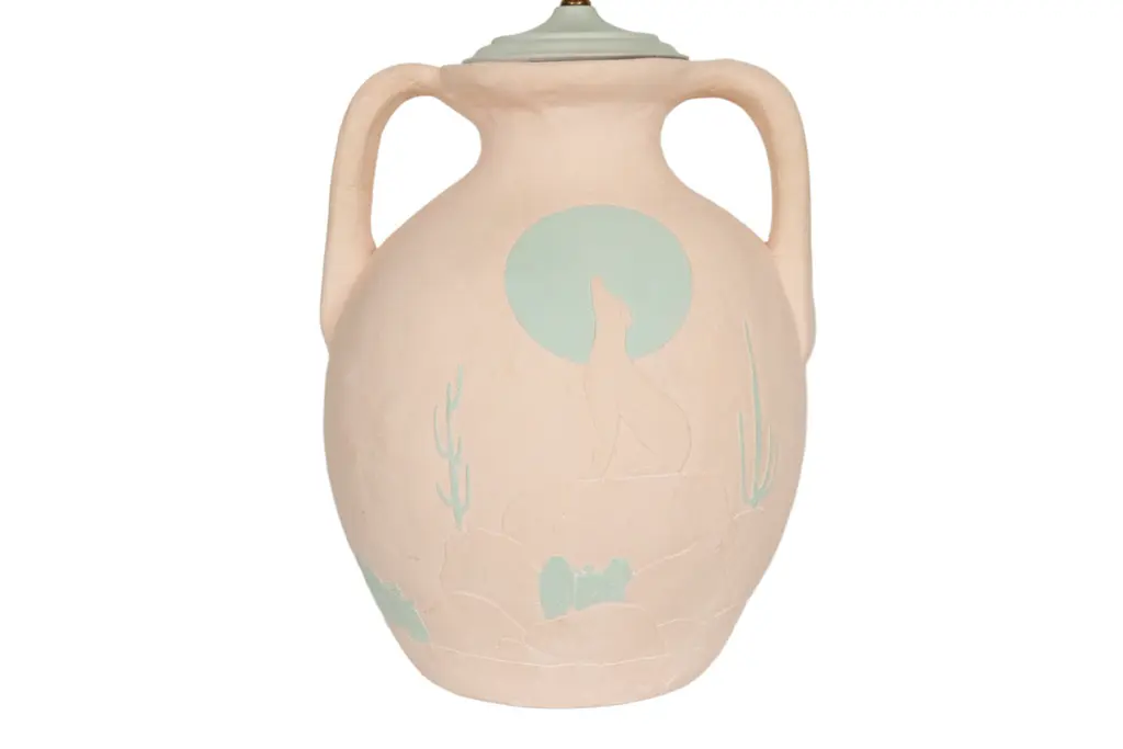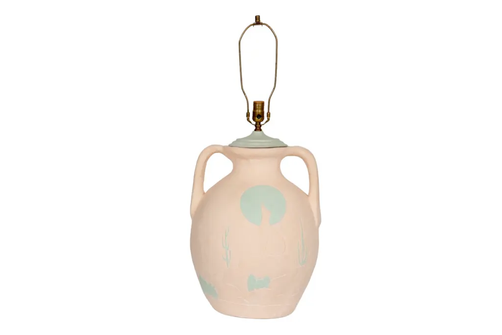 A southwestern earthenware amphora table lamp. Hand crafted, with a pink finish and decorated on both sides with an embossed and engraved desert scene. A coyote howls in front of a sea green moon, surrounded by pink sand dunes and green cacti. The custom, cream string lampshade is made by the notable Hilo Steiner of Shrewsbury, New Jersey. Maker's label can be seen on the inside of the top of the shade. Measures 23"H to top of socket, 32.5"H to top of finial. Shade measures 26”D x 14”H.
