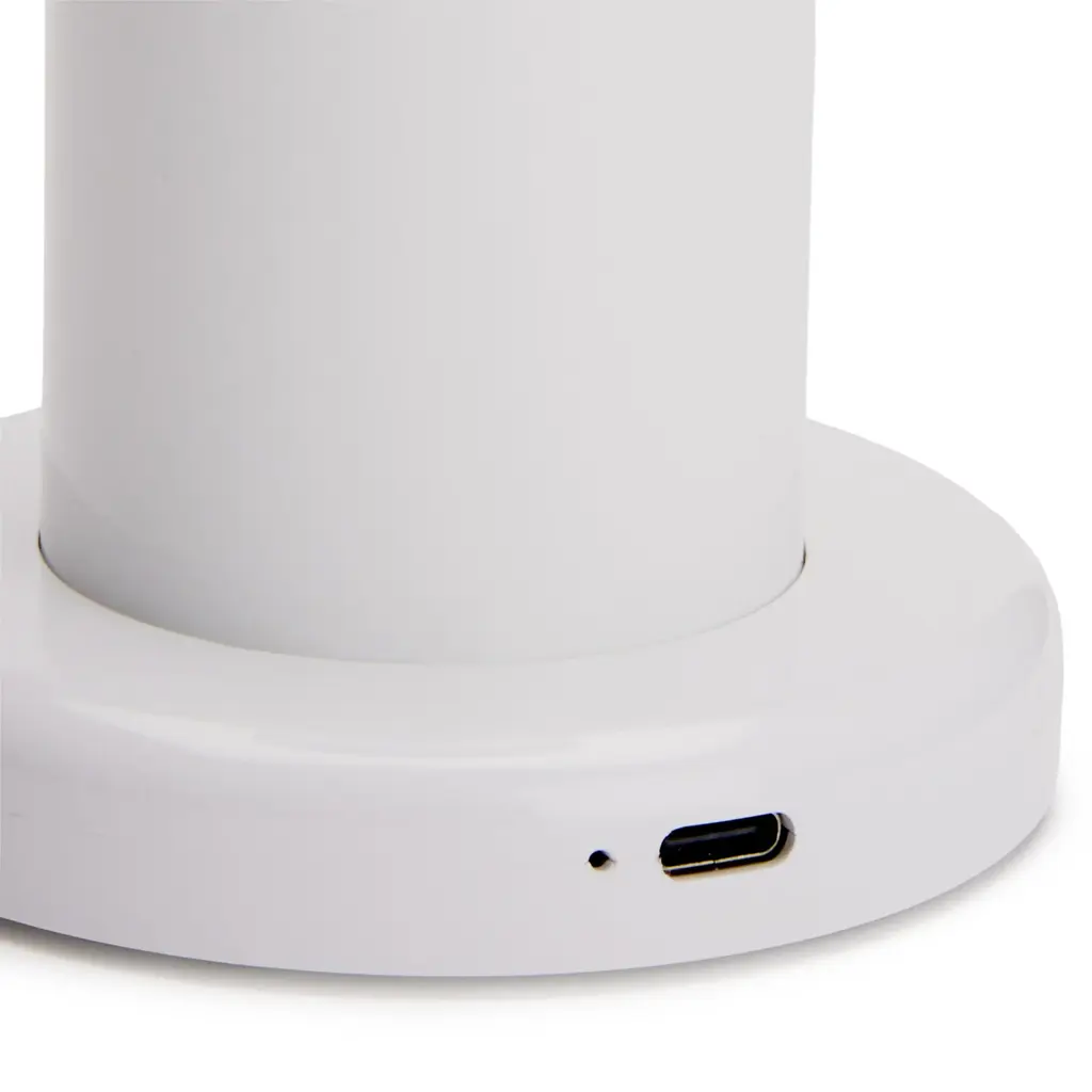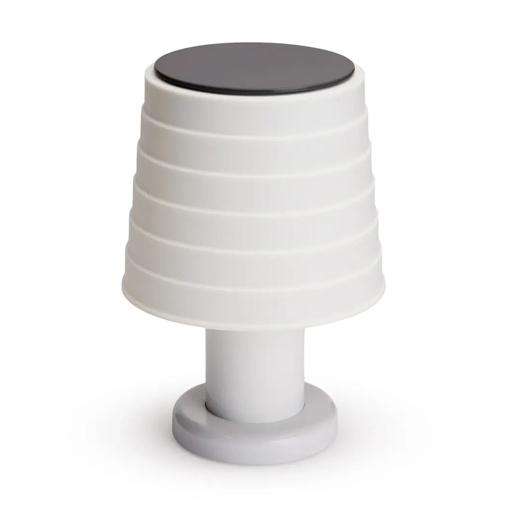 MoMA Exclusive: From SOWDEN, the brand of George Sowden, is the PL5 Portable Lamp, a rechargeable lamp composed of a painted aluminum stand and shades made from silicone—a material that George Sowden discovered is a great diffuser of light, long-lasting and easy to clean. SOWDEN have focused on improving the performance of the battery-powered models, typically suitable for restaurant tables and bar counters where mains power is impractical, as well as indoor and outdoor home use. The PL5 is fitted with a custom-designed and made SOWDEN LED light source (160 lumens). It has an integrated touch sensitive dimmer control and a unique screw-in fitting that allows it to be replaced when necessary. The PL5 lamp also contains two protected 18650 lithium-ion replaceable batteries and, instead of relying on lengthy recharging in the lamp, they can also be changed easily with fully charged replacements, allowing immediate use. In restaurants, batteries can be swapped during service without ever leaving guests in the dark. For home use, you can recharge when required with the included USB cord. The shade is also removable for easy cleaning. Charges via USB (cable included) for five hours of light at maximum brightness when fully charged. Use the SOWDEN PL5 Portable Lamp wherever you need extra light, from your dining table to your bedside table to your outdoor space. It measures 8.3h x 5.3"diam.