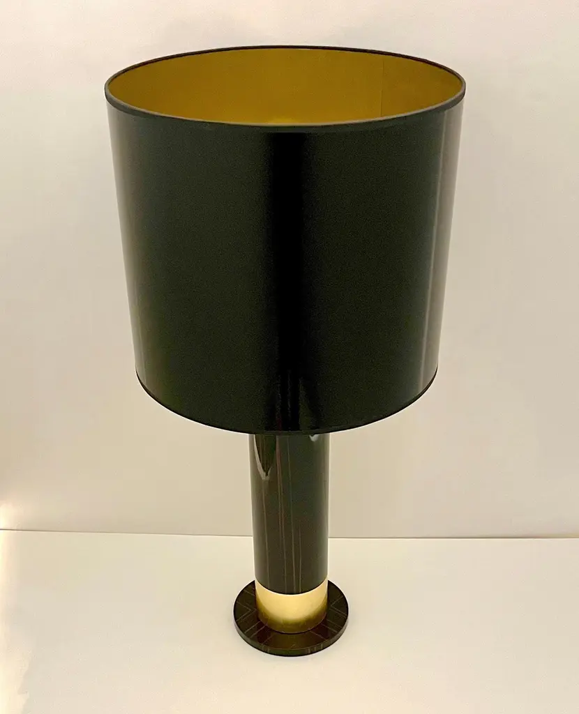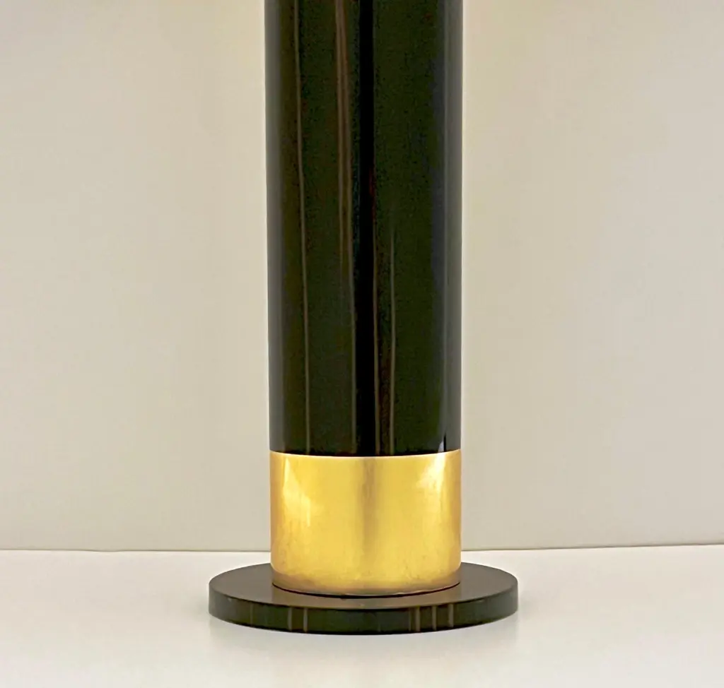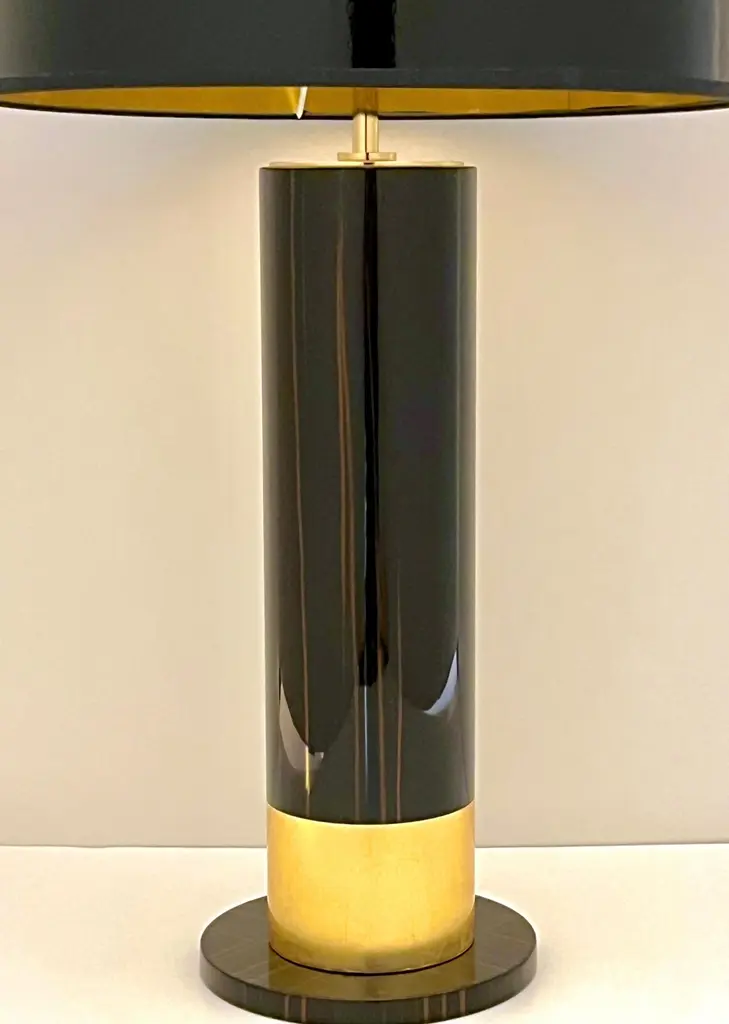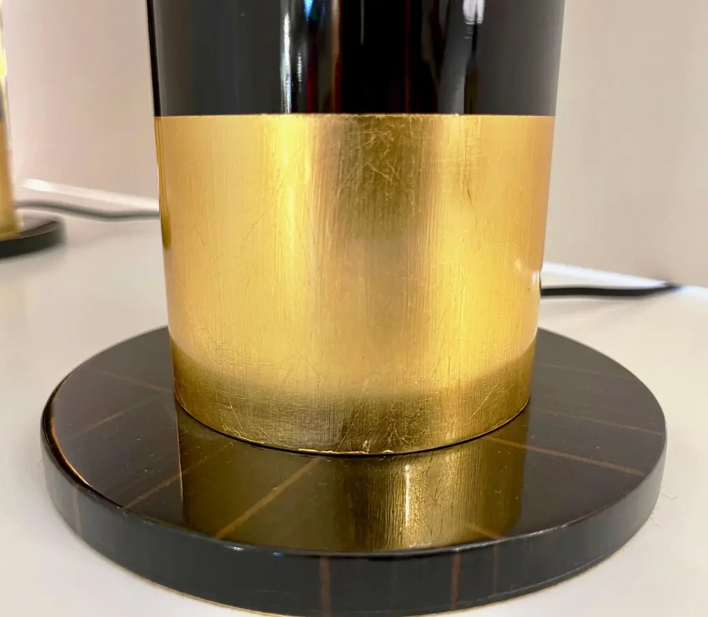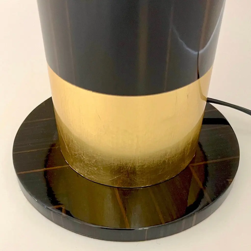 Spanish Art Deco Design Pair Of Black Brown Veneer & Gold Leaf Cylindrical Lamps