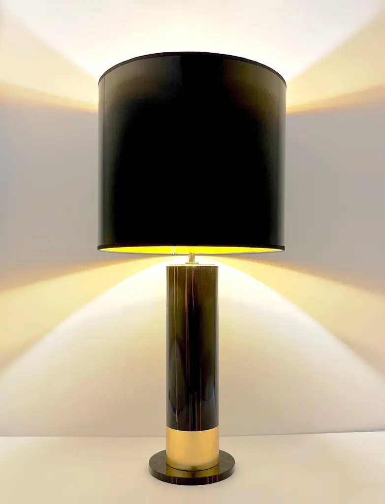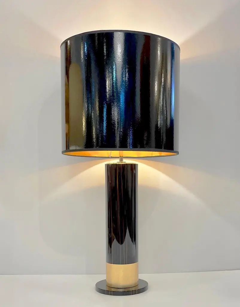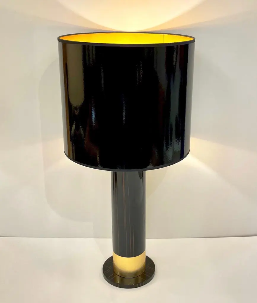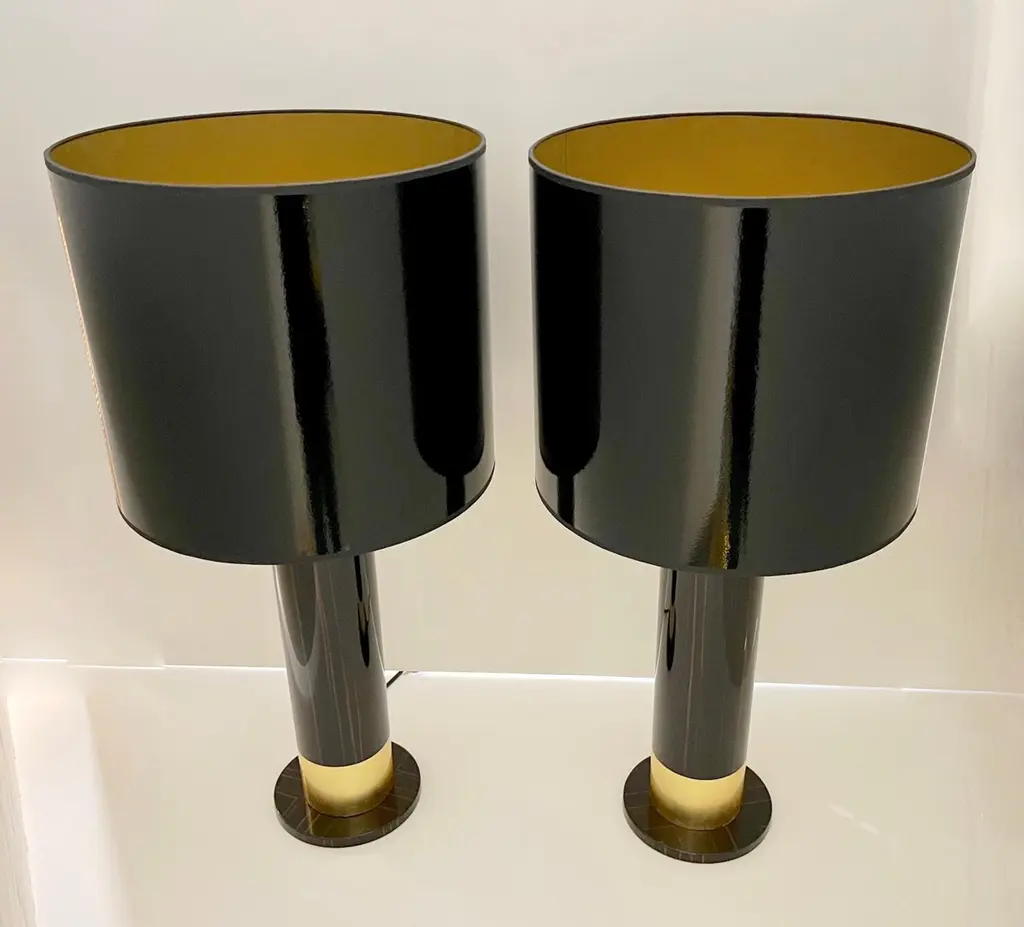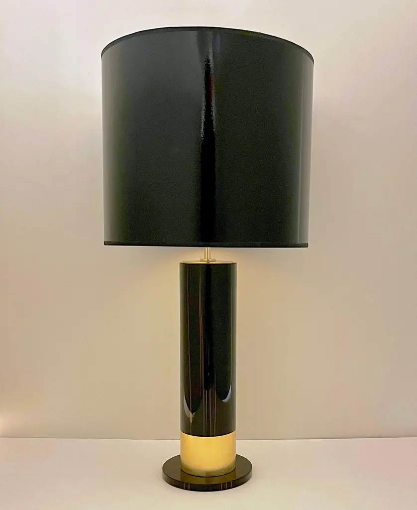 Spanish Art Deco Design Pair Of Black Brown Veneer & Gold Leaf Cylindrical Lamps
