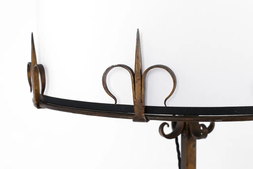 A run of seven gilt forged iron table lamps in the taste of Les Artisans de Marolles, with decorative fleur-de-lis detailing, three point bases and new white cotton shades with black trim. From a hotel in Andalusia, southern Spain, c. 1960.