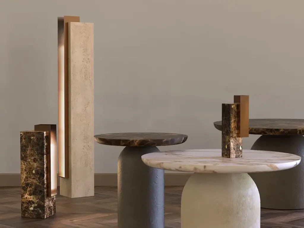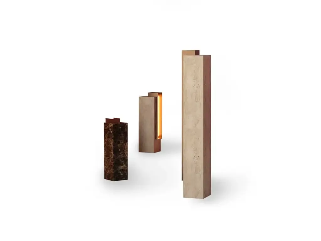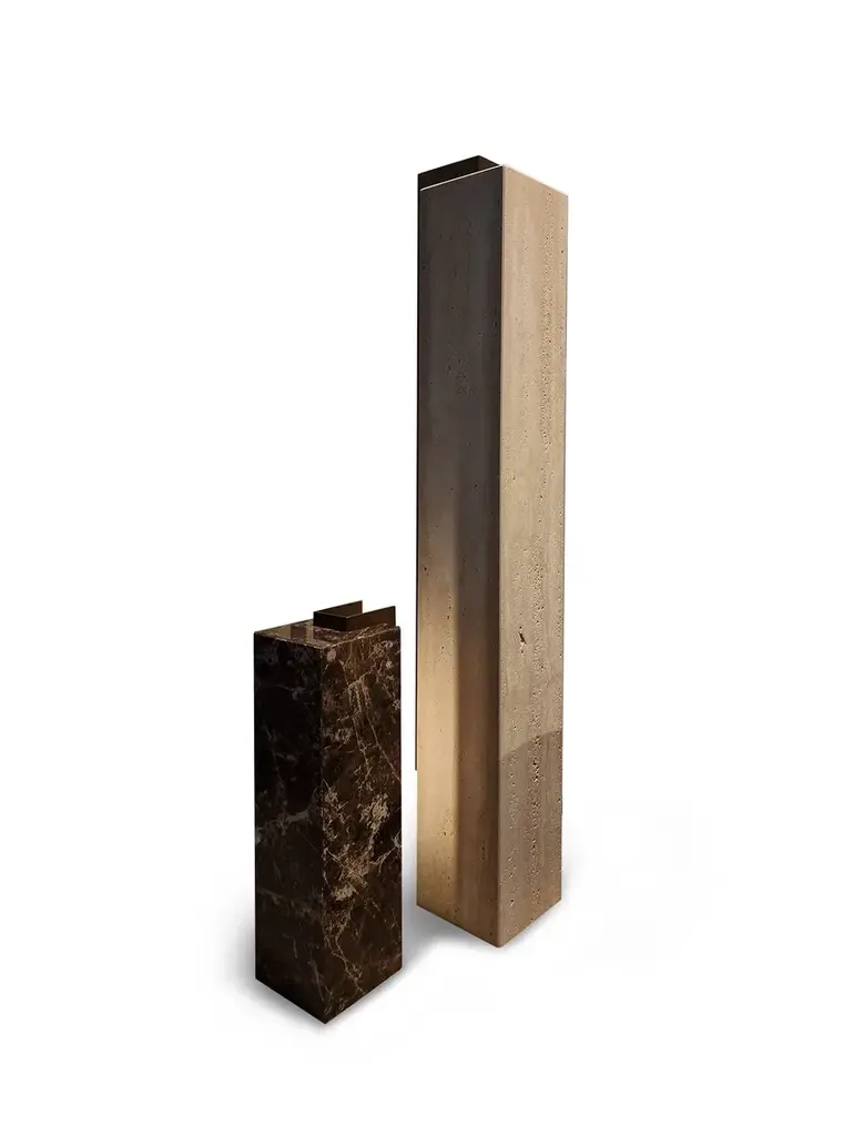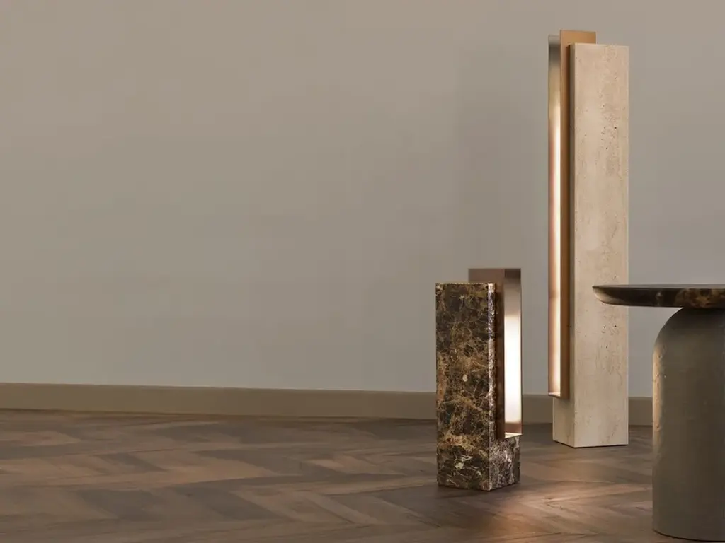 Specchia is a table lamp, with indirect light, with switch, in marble and metal. It is available in two versions: Travertine and bronze or in the Dark Emperador and bronze. Despite its strong character and its modern design, Specchia is the ideal lamp to create intimate atmospheres and sweet light effects.