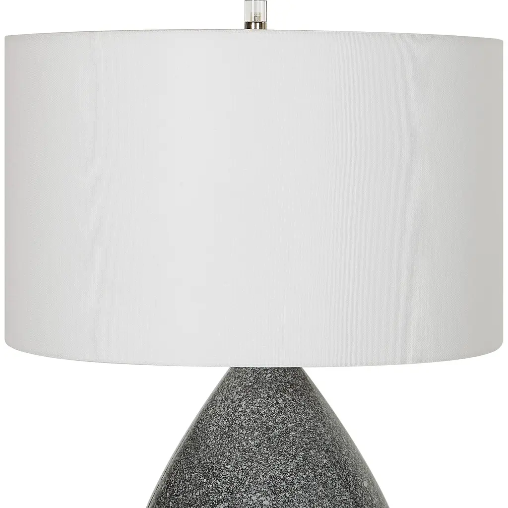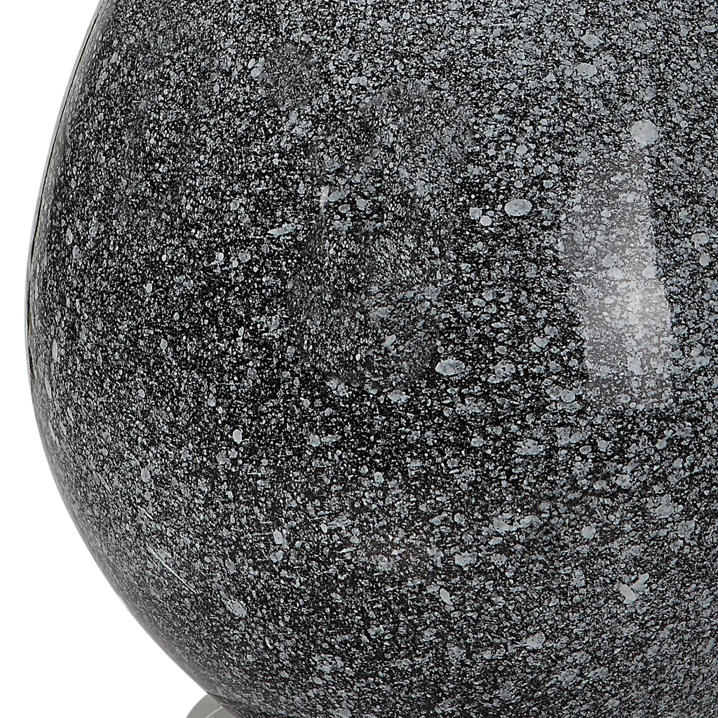 Add modern flair to any room with this ceramic table lamp, featuring a distinctive black and white speckled glaze that creates a bold, artistic statement. Polished nickel-plated accents and a thick crystal foot lend a touch of sophistication and shine, balancing the playful texture of the base. Topped with a round hardback shade in crisp white cotton fabric, it casts a soft, clean light. Perfect for contemporary or transitional spaces, this lamp blends visual interest with timeless elegance. Product Features: Speckled glaze design Polished nickel plated finish Crystal foot Lamp uses (1) 150-watt TYPE A bulb - not included Socket type: 3-way UL listed for indoor use Dimensions: Overall: 26.25" high x 17" diameter Shade height: 10" high x 17" diameter Material(s): steel/ceramic/crystal