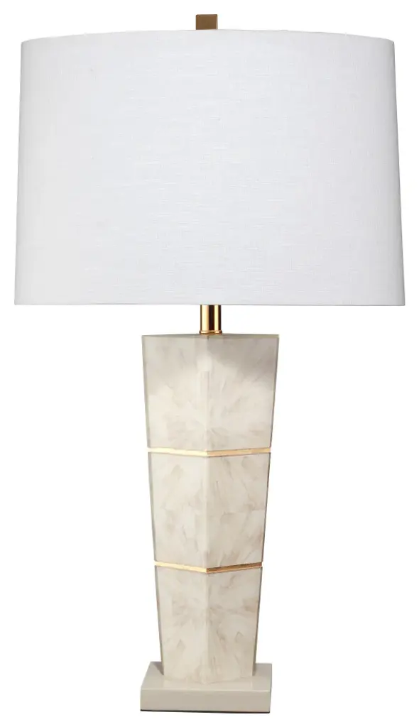 Add the spectacular beauty of natural burnished horn with none of the cruelty to your home. The horn inspired patterns are created by artisans from layers of soft gray lacquer and accented with genuine gold leaf rings. Balanced with a linen shade and cubed cylinder finial in matching gold leaf. Crafted of MDF, Paper and Lacquer100% White Linen Tapered Oval ShadeGold Leaf Cylinder FinialPattern and finish may vary, no two are exactly alike. These unique imperfections give our products character and individuality, with each piece having its own personality.Lamp Dimensions: 18.5"H x 6" Sq. Footprint''shade Dimensions: 12"H x 18"W x 8"D, Top Diameter 17"1 bulb required; Bulb Not Included150 Max Wattage; 120 VoltsE26 Bulb Base Type 8 Ft Clear/Silver Cord3-way SwitchCare Instructions: Wipe clean using a soft, dry cloth or static duster. Avoid using harsh or abrasive cleaners as they can damage product. Do not exceed specified wattage.