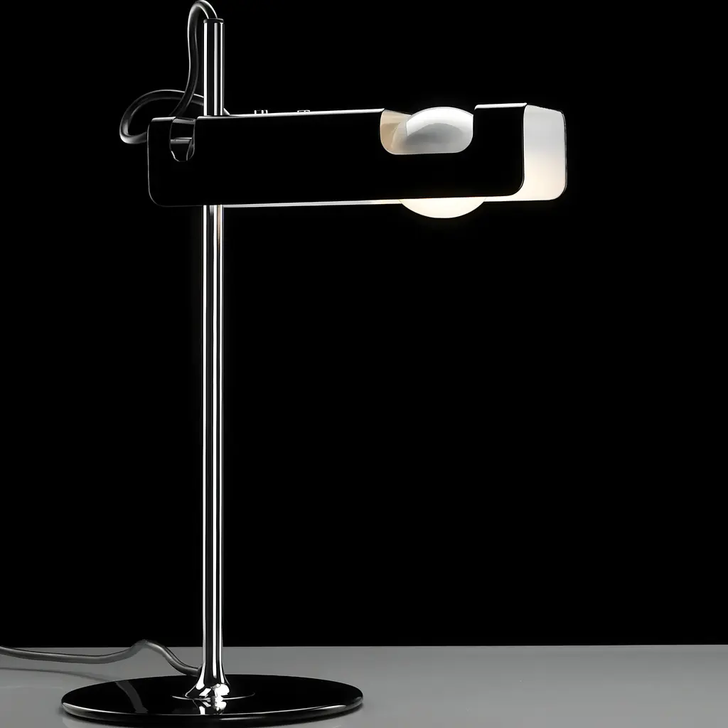 Spider's high-tech impression was ahead of its time at its 1965 unveiling by Italian designer Joe Colombo. The table lamp's unique look comes from a box-like lacquered aluminum reflector ingeniously configured for a special horizontal spot lightbulb. Mounted on a chromium-plated stem, the adjustable light tilts as needed. Spider is part of the permanent collection of the Milan Triennale and was also featured in the memorable 1972 exhibit, “Italy: The New Domestic Landscape” at MoMA in New York.