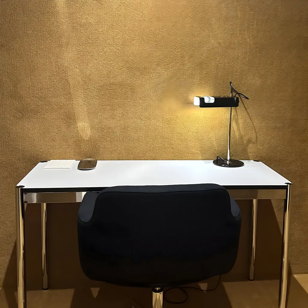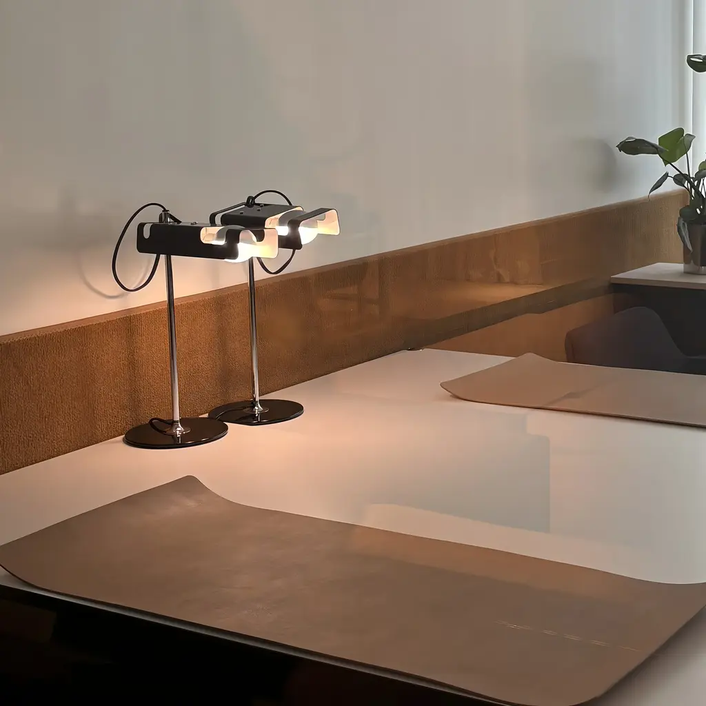 Spider's high-tech impression was ahead of its time at its 1965 unveiling by Italian designer Joe Colombo. The table lamp's unique look comes from a box-like lacquered aluminum reflector ingeniously configured for a special horizontal spot lightbulb. Mounted on a chromium-plated stem, the adjustable light tilts as needed. Spider is part of the permanent collection of the Milan Triennale and was also featured in the memorable 1972 exhibit, “Italy: The New Domestic Landscape” at MoMA in New York.