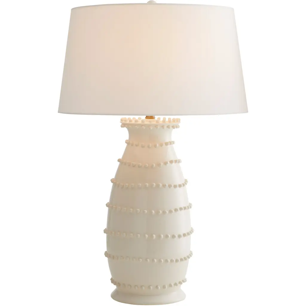 This elegant ivory crackled ceramic table lamp is accented with hand-applied soft beaded bumps. Topped with a matching ceramic finial and an off-white microfiber shade lined in matching off-white cotton for a subtle glow. Finish will vary.