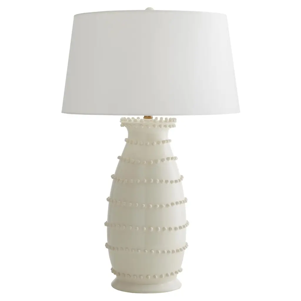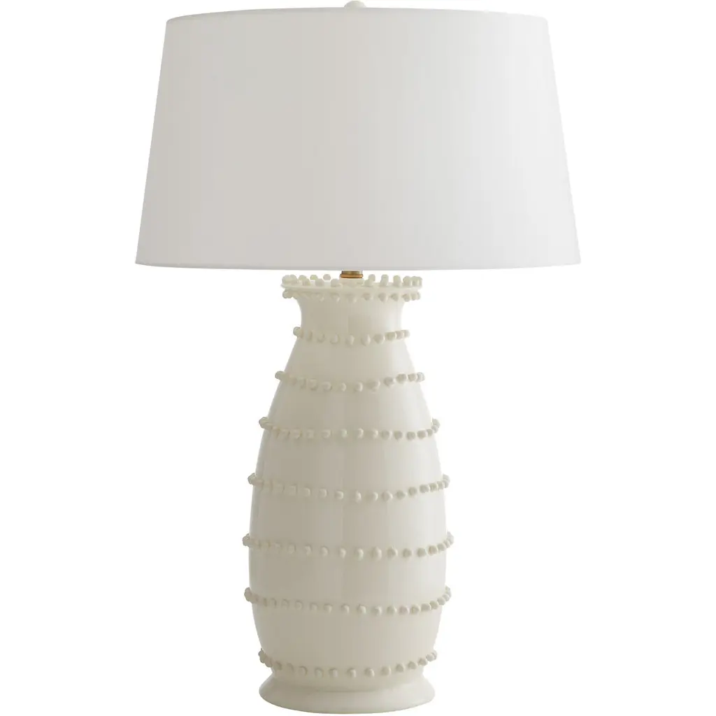 This elegant celadon finished ceramic table lamp is accented with hand-applied soft beaded bumps. Topped with a matching ceramic finial and an off-white microfiber shade lined in matching off-white cotton for a subtle glow. Finish will vary.