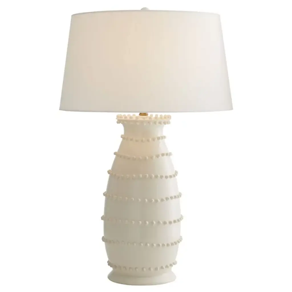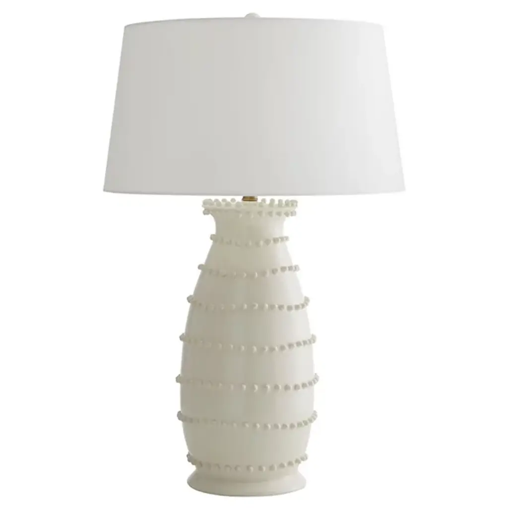 Festive, sophisticated, artful. The Spitzy Table Lamp from Arteriors animates the spaces with waves of hand-applied beads glazed in rich light. The modern design reveals itself with a chic personality. It strikes a gorgeous figure with a curvy body made from crackled ceramic. The deep texture of the ceramic creates a fascinating background for the soft beads arranged on top. These beads flow naturally around and catch fine highlights when the piece is on. A spacious microfiber shade above disperses ample ambient light with glare-free properties.