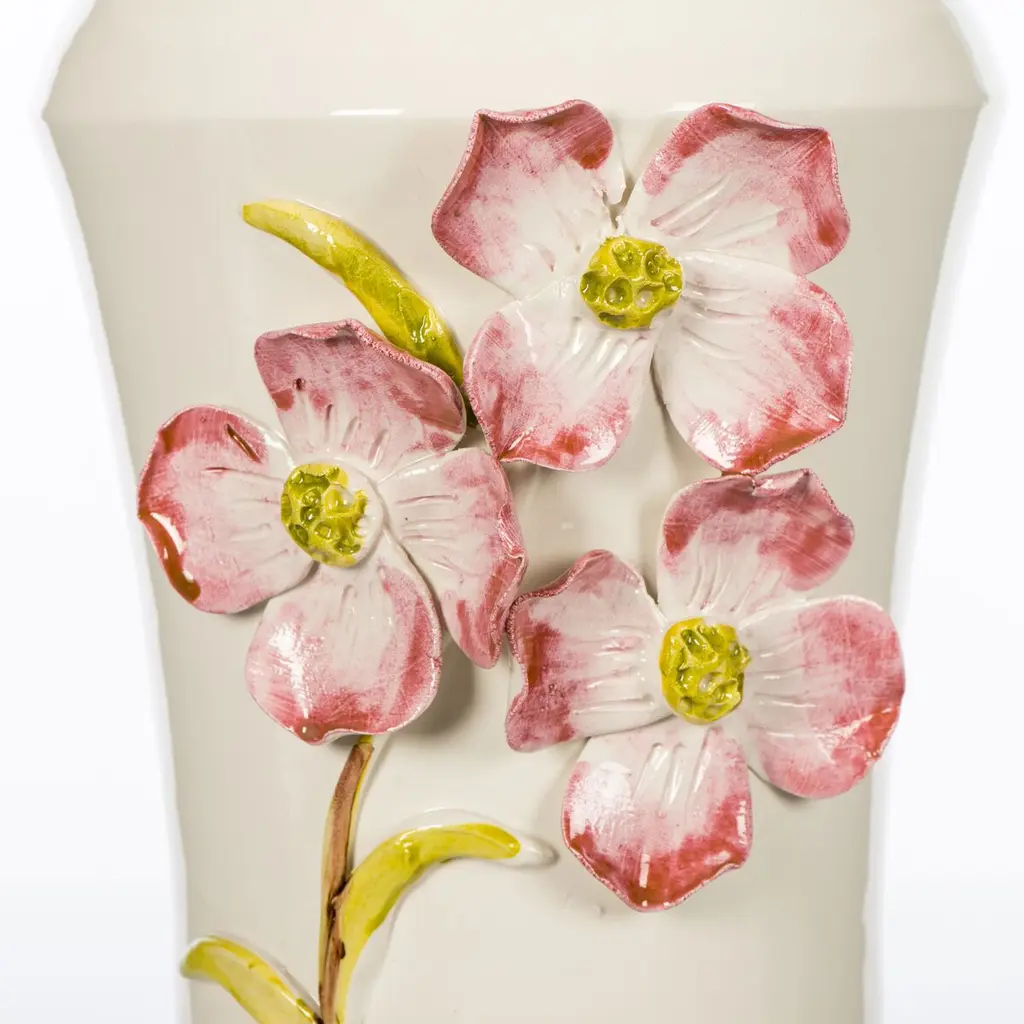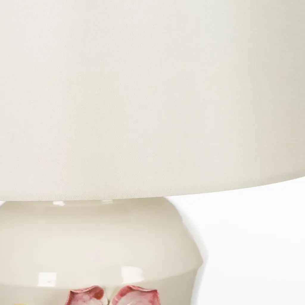 Dainty flowers create a textured display that turns this casual ceramic table lamp into a work of art. Stylize a bedroom or main living area with a lamp showcasing hand-thrown ceramic with sweet dogwood florals embossed on its jar silhouette, as an antique gold metal base and linen drum shade maintain the consistency of a charming, art-inspired lamp.