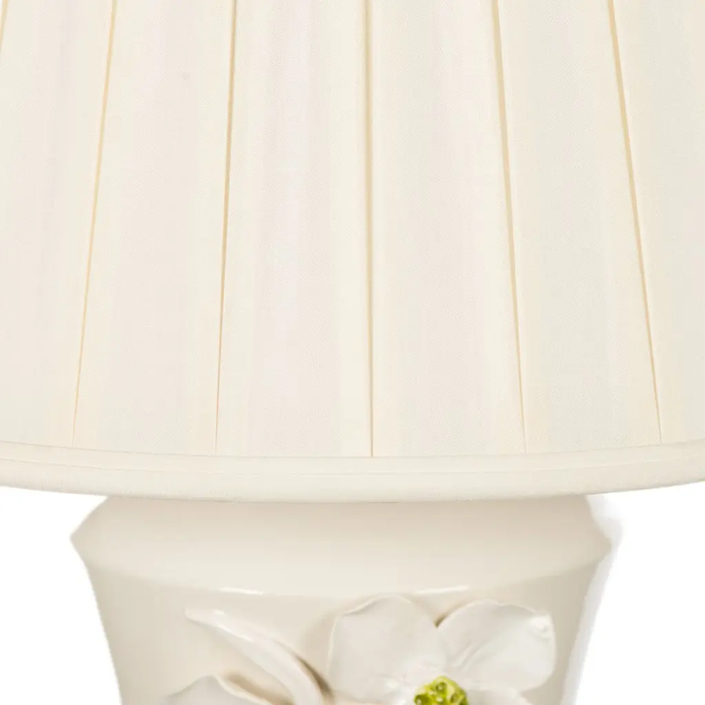 Dainty flowers create a textured display that turns this casual ceramic table lamp into a work of art. Stylize a bedroom or main living area with a lamp showcasing hand-thrown ceramic with sweet dogwood florals embossed on its jar silhouette, as an antique gold metal base and linen drum shade maintain the consistency of a charming, art-inspired lamp.