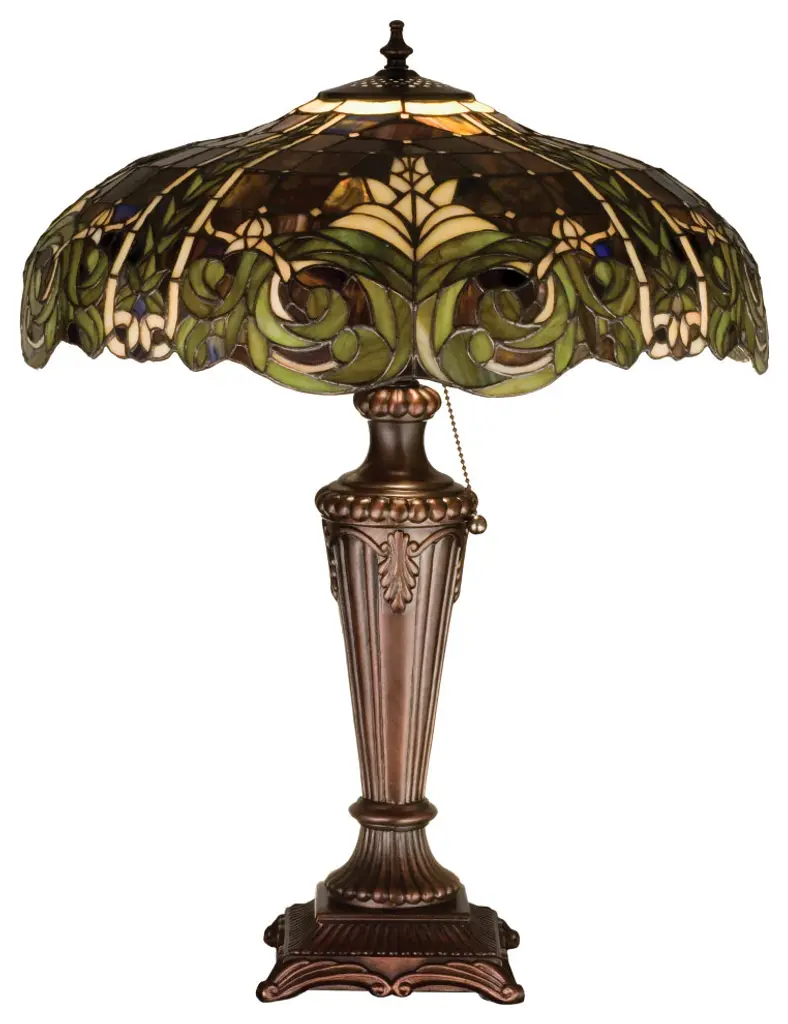 UL Approved/ Dry/ Plug/ Med Base - E26/ 2 x 75W Bulb Not Included/ Our Aldridge table lamp is a modern twist on classic Tiffany''style. Large panels of creamy amber art glass provide an excellent backdrop for panels of yellow, green, blue and red peacock-inspired insets at each point of the scalloped shade. Each of the 108 pieces of art glass and''art glass jewels in the shade have been individually hand rolled and copper foiled using the same technique first developed by Louis Comfort Tiffany. The peacock theme continues in the intricately carved metal base, which is finished in rich antique bronze for an authentic Tiffany feel. The perfect choice for an end table or larger nightstand, Aldridge''s timeless beauty will become the focal point in any room where it is displayed.