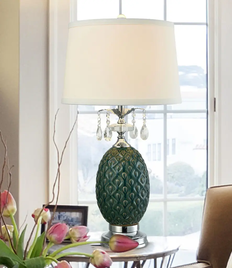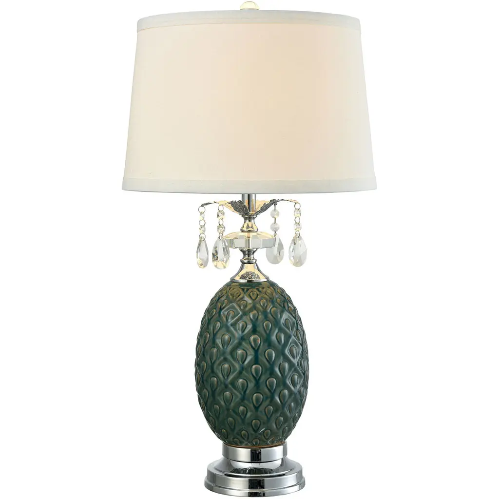 UL Approved/ Dry/ Plug/ 1 x 7.5W LED Bulb Included/ 560 Lumen/ Our Maxie Crystal Table Lamp features a contemporary flair that will easily accentuate any decor style in your home or office. The generously sized fixture''sits upon a fluid stepped pedestal base finished in gleaming polished chrome. The magnificent center column is crafted of warm amber ceramic in a lovely turtleback pattern. Just above, a gleaming vase cap and metal fronds, in matching polished chrome are adorned with a solid crystal column break. A crystal beaded chain and faceted crystal teardrop hangs from the tip of each frond. Maxie is topped with an elegantly simple drum shade in crisp white fabric and solid crystal orb finial and is wired with our fully dimmable 7.5W LED module, which will direct light downward over the metal and crystal for a dazzling shower of sparkles. An ideal choice for living rooms, dens or bedrooms, try displaying Maxie in pairs on end tables or night stands for a truly stunning effect.