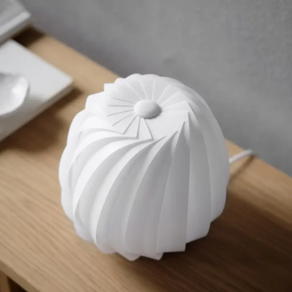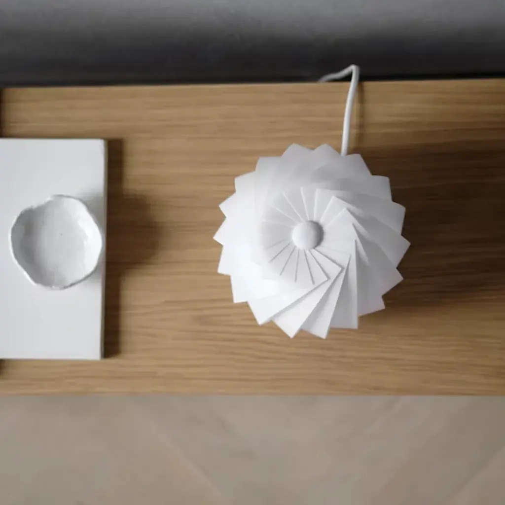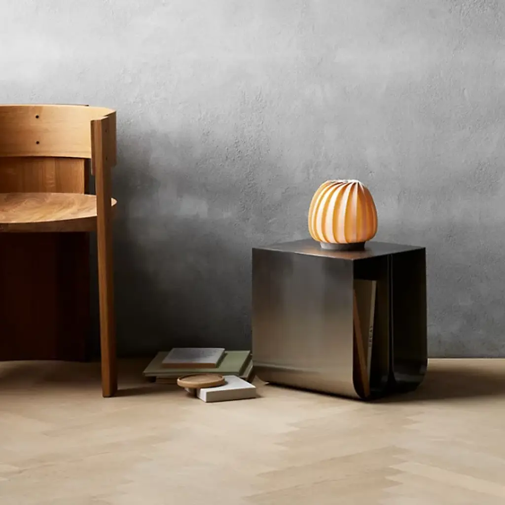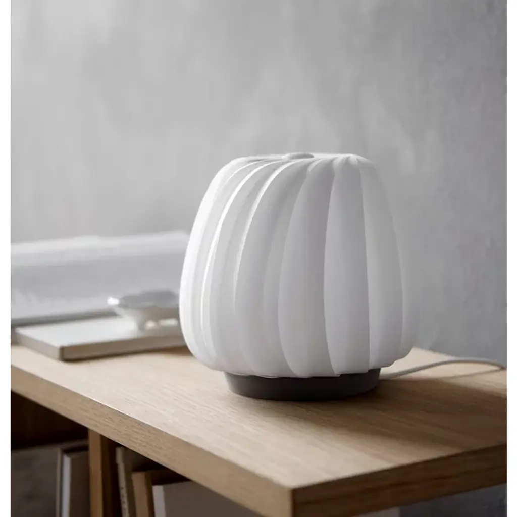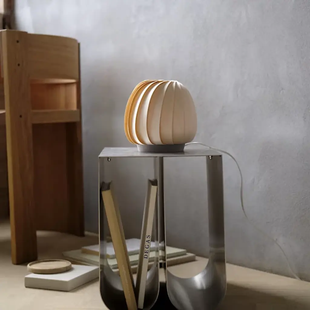 The ST906 Mini Table Lamp from Tom Rossau brings a soft, inviting glow to table or desk spaces through a design rooted in natural inspiration. Handmade in Denmark, its compact form draws from the gentle hills and luminous lights of Rossau’s childhood in Odsherred. Grounded by a simple wooden disc base, the 8.5-watt (800 lumens) light illuminates a rounded shade composed of delicately layered strips of natural birch veneer or coated paper, transforming glare into a warm, glowing ambiance.
