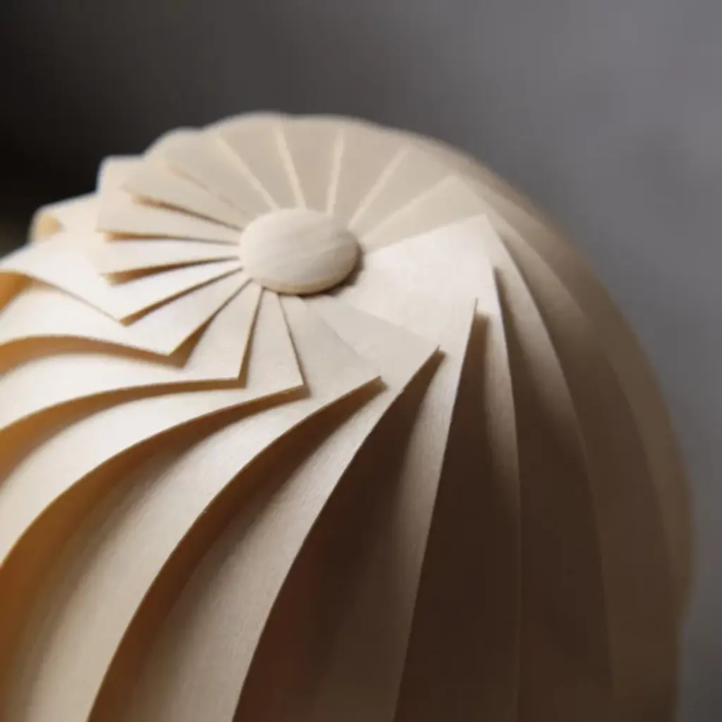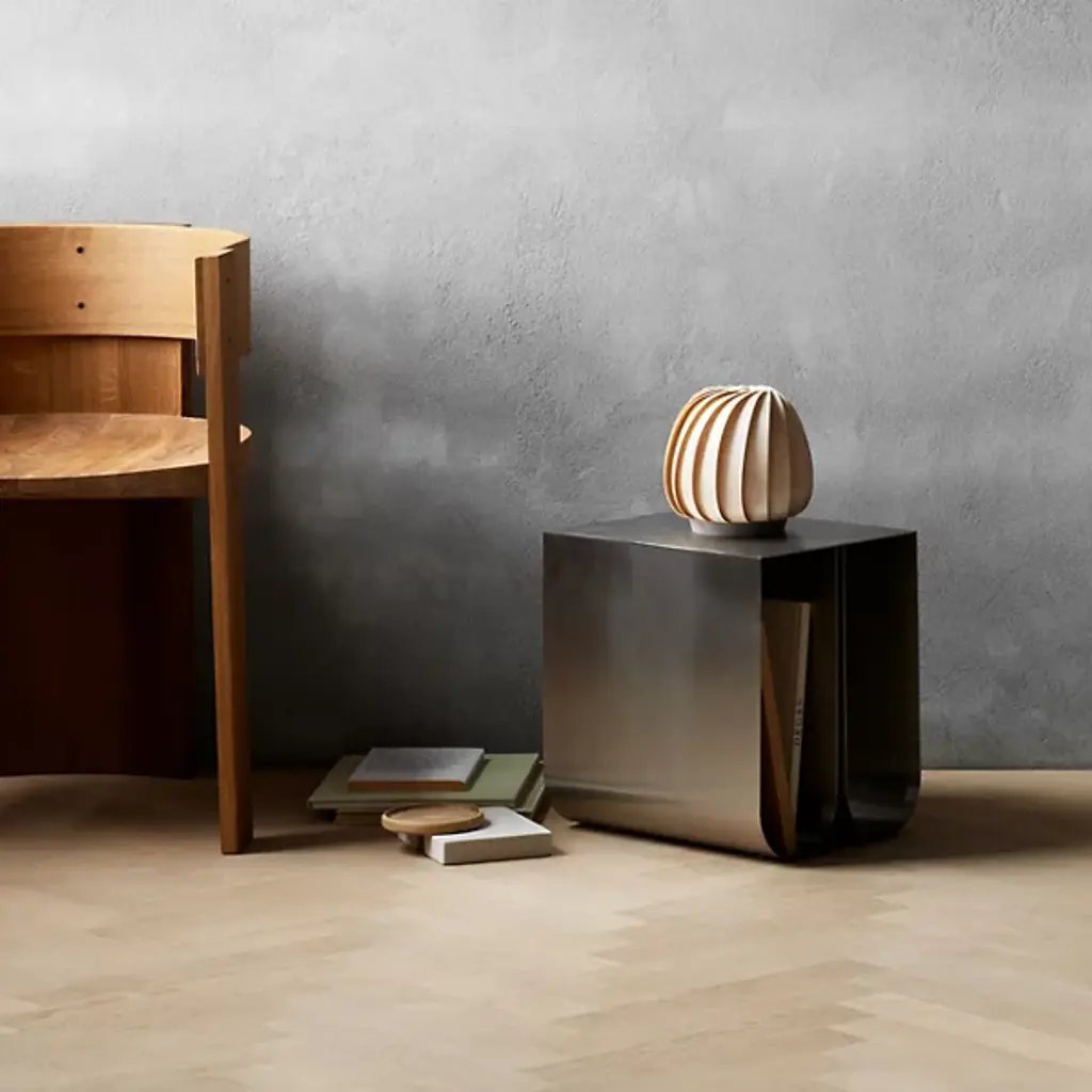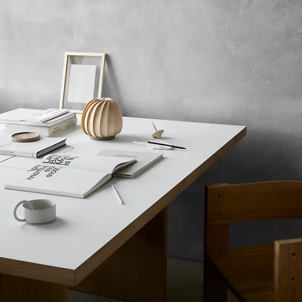 The ST906 Mini Table Lamp from Tom Rossau brings a soft, inviting glow to table or desk spaces through a design rooted in natural inspiration. Handmade in Denmark, its compact form draws from the gentle hills and luminous lights of Rossau’s childhood in Odsherred. Grounded by a simple wooden disc base, the 8.5-watt (800 lumens) light illuminates a rounded shade composed of delicately layered strips of natural birch veneer or coated paper, transforming glare into a warm, glowing ambiance.