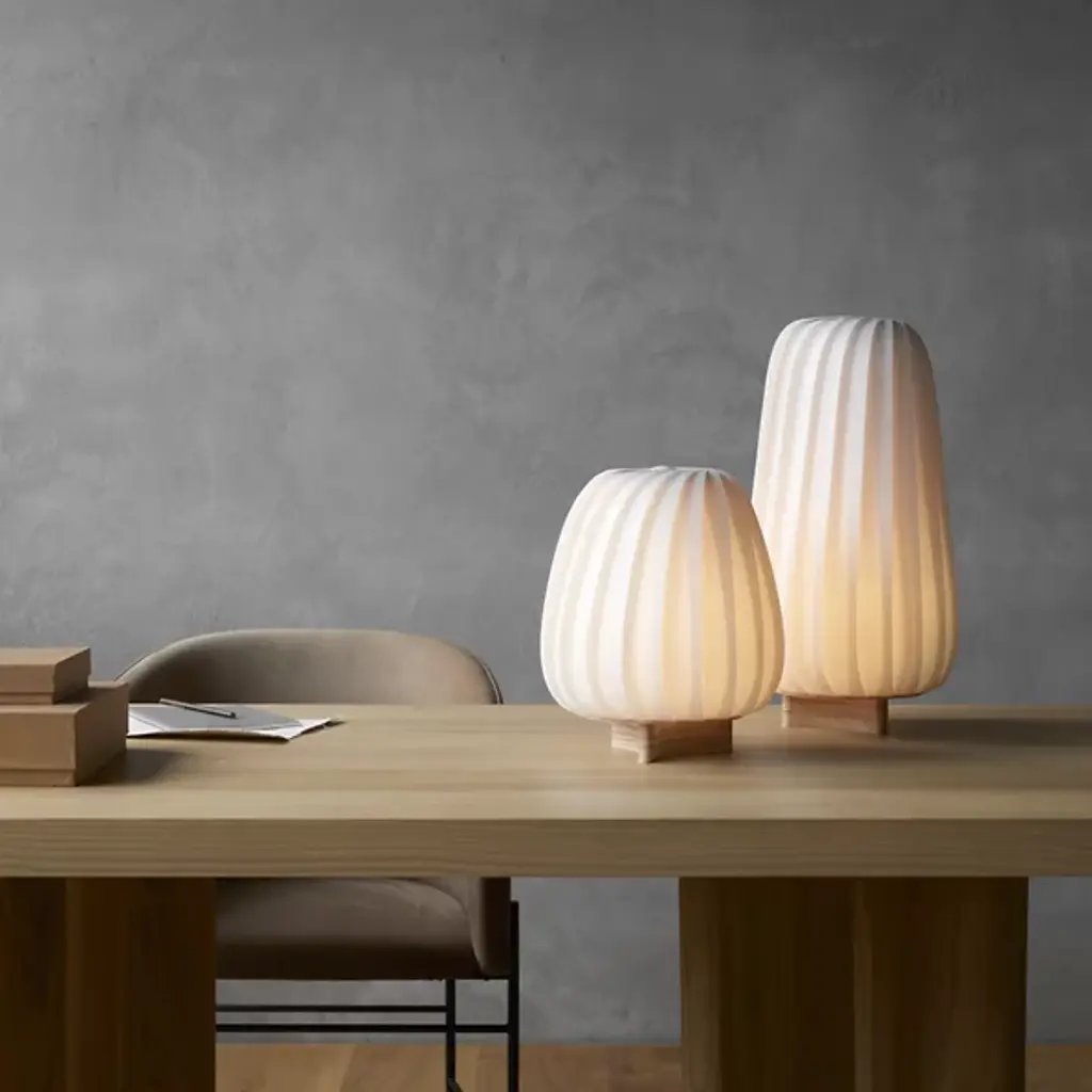 The ST906 Table Lamp from Tom Rossau is all about simple warmth. Inspired by a childhood Rossau spent in the natural setting of Odsherred, Denmark, the rounded hills and almost magical light of the region are on full display in each handmade lamp. The 8.5 Watt (800 Lumens) lamp is set inside a rounded shade made from strips of either natural birch veneer or coated paper, creating a surface that captures glare, transforming it into a glowing spectacle. The light within shows off the folds and spirals of the shade construction, while a slender wooden base anchors the fixture while keeping its layered construction on full display.