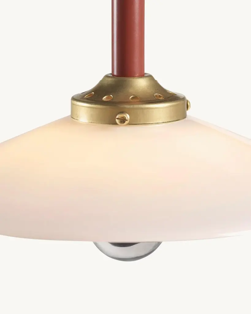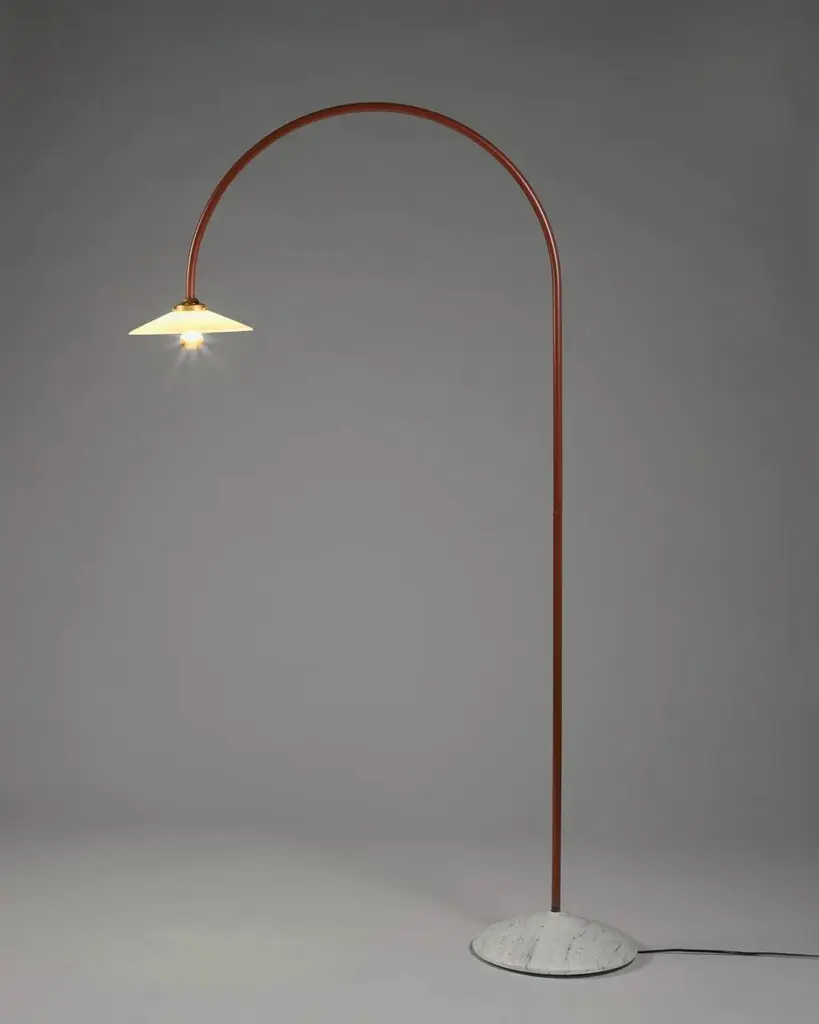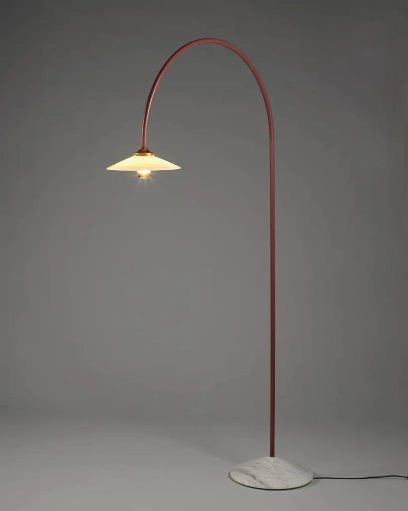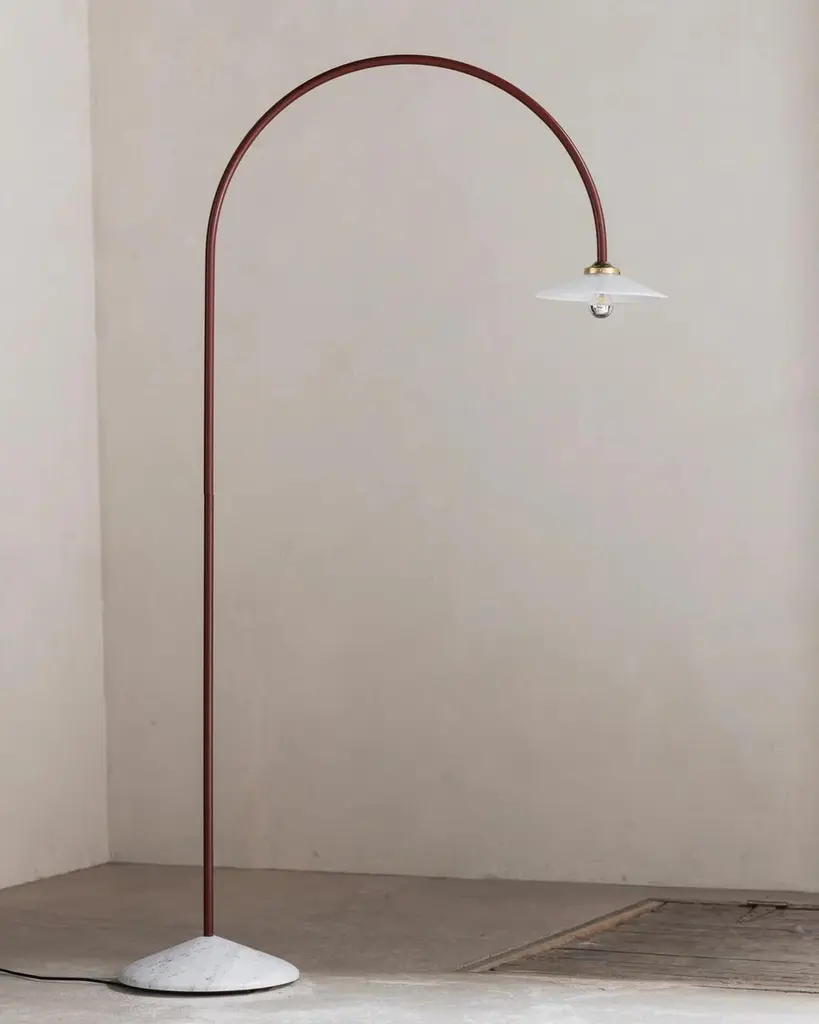 Standing Lamp Marble N°2 by Muller Van Severen x Valerie ObjectsDimensions: L 103 W 34 H 172 CMFinish: Menie Redmaterials: steelfitting type: e27bulb(s) included: yesbulb replaceable: yesdimmable: nomax. voltage: 240 voltmax. wattage: 4 wattswitch: yesheight-adjustable: noinstallation instructions included: yesoperating environment: indoor dry location"The standing lamp is a continuation of the hanging lamp that we presented during our very first exhibition, which was held at Valerie Traan, the gallery of Valerie Objects’ art director Veerle Wenes." Fien says. Indeed, these lamps originate from the same concept, which is the materialization of simple and colorful drawings in the space of the interior. Similar to the hanging lamp, this standing lamp consists of practically nothing more than one fluent, curved line with a bulb attached to the end of it. Since this object needs to stand on the ground, two small lines were added, becoming the legs of the lamp. On one hand the basic design doesn’t draw too much attention, on the other hand its playful character does tingle the eye. To emphasize this frolic appearance, the lamp is offered in joyous colors.Although most design lovers know of Muller Van Severen for their furniture, the design couple’s story actually kicked off with the conception of these hanging lamps. “It all started out of necessity”, Hannes explains. “We were working in our new home which is an old house. Above the table there wasn’t a socket in the ceiling to stick a lightbulb in, so we designed a lamp that could hang from the wall”. Like all Muller Van Severen’s furniture, the lamps add a sober but colorful line to the interior. On one hand the sober design doesn’t draw too much attention, on the other hand its playful character does tingle the eye.The lamps create space rather than filling it up.