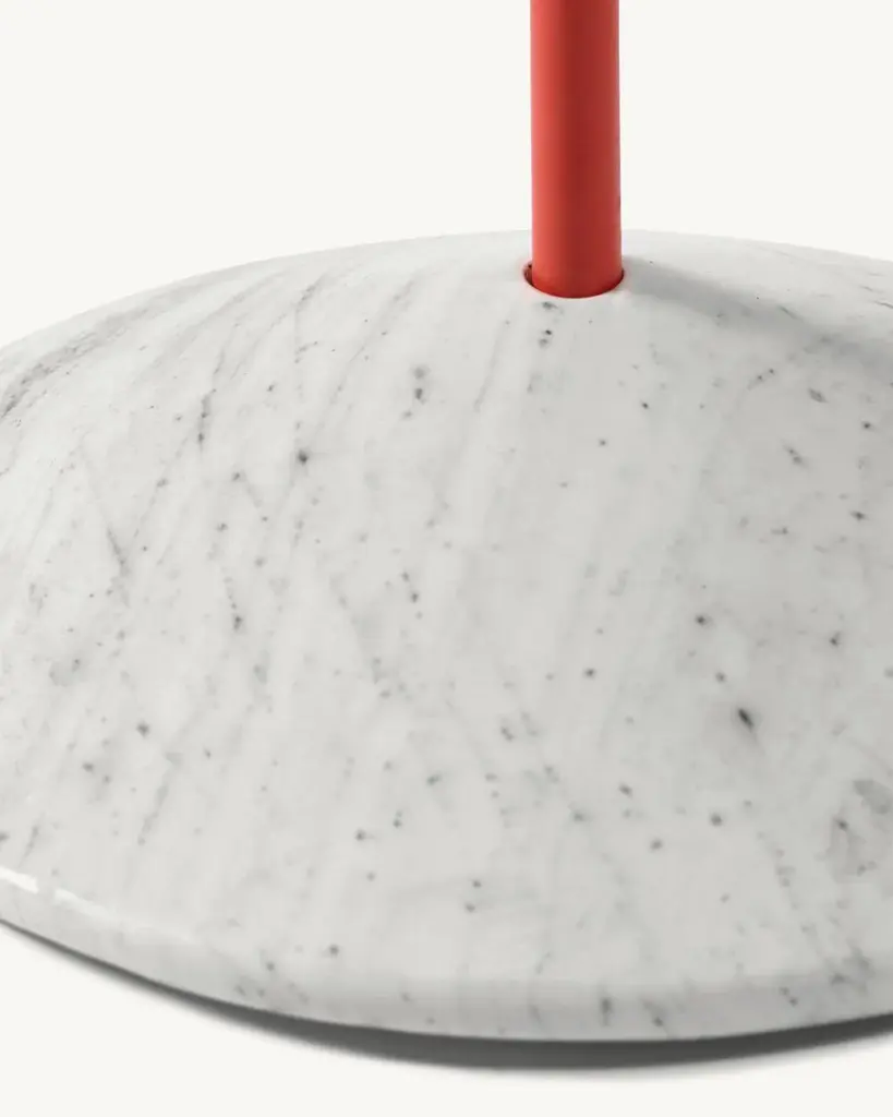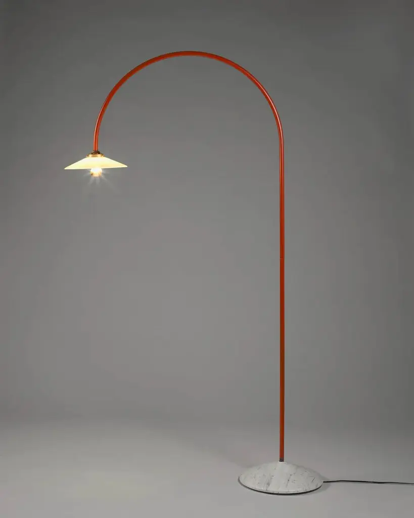 Standing Lamp Marble N°2 by Muller Van Severen x Valerie ObjectsDimensions: L 103 W 34 H 172 CMFinish: Redmaterials: steelfitting type: e27bulb(s) included: yesbulb replaceable: yesdimmable: nomax. voltage: 240 voltmax. wattage: 4 wattswitch: yesheight-adjustable: noinstallation instructions included: yesoperating environment: indoor dry location"The standing lamp is a continuation of the hanging lamp that we presented during our very first exhibition, which was held at Valerie Traan, the gallery of Valerie Objects’ art director Veerle Wenes." Fien says. Indeed, these lamps originate from the same concept, which is the materialization of simple and colorful drawings in the space of the interior. Similar to the hanging lamp, this standing lamp consists of practically nothing more than one fluent, curved line with a bulb attached to the end of it. Since this object needs to stand on the ground, two small lines were added, becoming the legs of the lamp. On one hand the basic design doesn’t draw too much attention, on the other hand its playful character does tingle the eye. To emphasize this frolic appearance, the lamp is offered in joyous colors.Although most design lovers know of Muller Van Severen for their furniture, the design couple’s story actually kicked off with the conception of these hanging lamps. “It all started out of necessity”, Hannes explains. “We were working in our new home which is an old house. Above the table there wasn’t a socket in the ceiling to stick a lightbulb in, so we designed a lamp that could hang from the wall”. Like all Muller Van Severen’s furniture, the lamps add a sober but colorful line to the interior. On one hand the sober design doesn’t draw too much attention, on the other hand its playful character does tingle the eye.The lamps create space rather than filling it up.