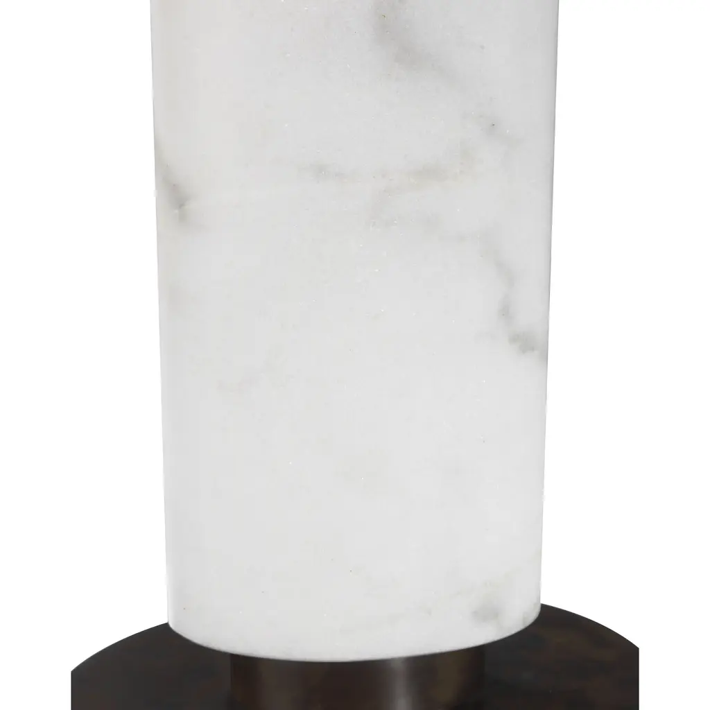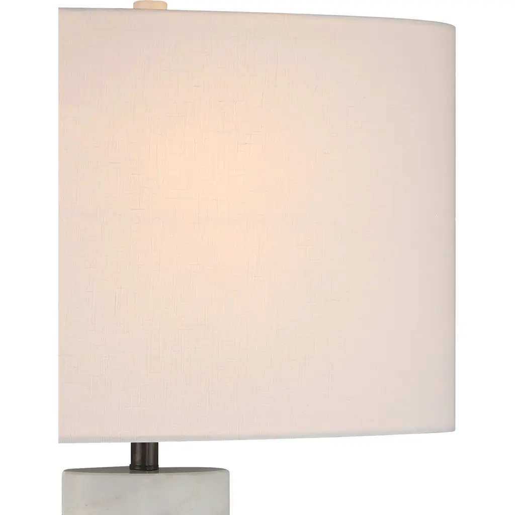 The Stanhope White Table Lamp features an elliptical body honed from white marble with natural dark gray veining, echoed in its larger oblong shade for a cohesive, sculptural look. Its architectural-inspired base adds depth and contrasta slightly oversized black metal disc rests on discreet feet and is topped with a smaller elliptical plinth, creating a layered design that gives the lamp a subtle floating effect.