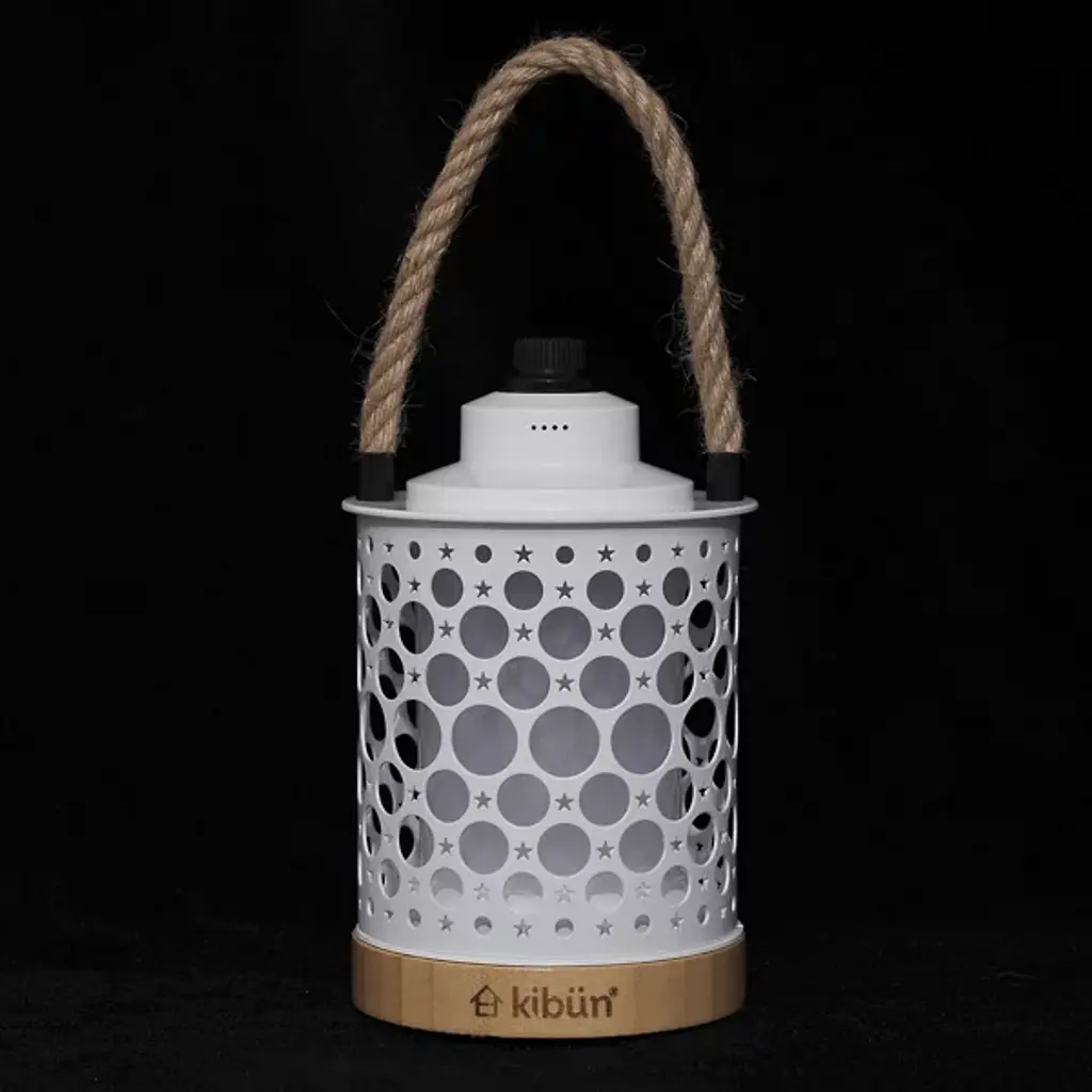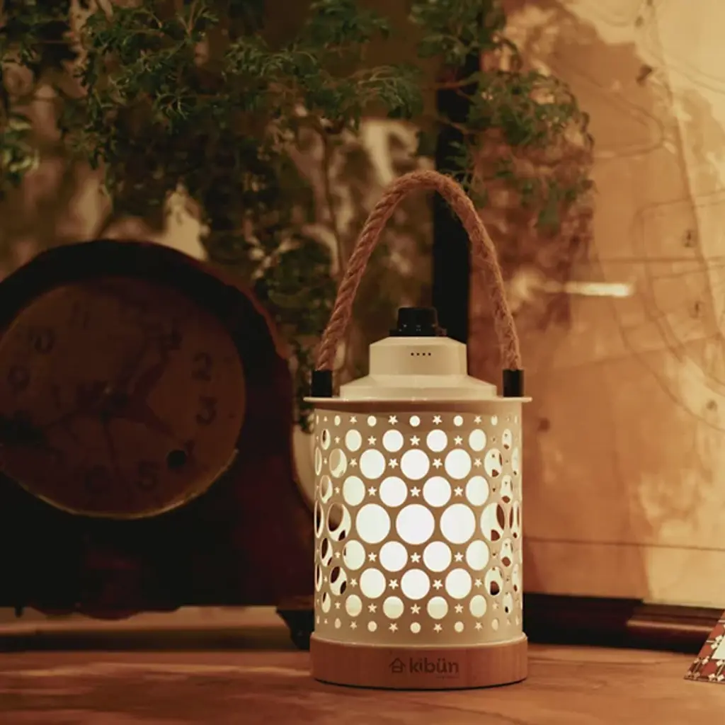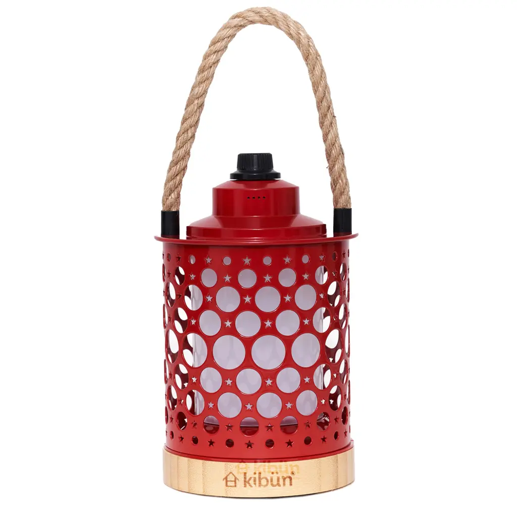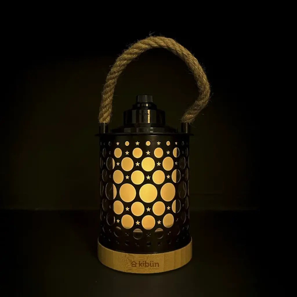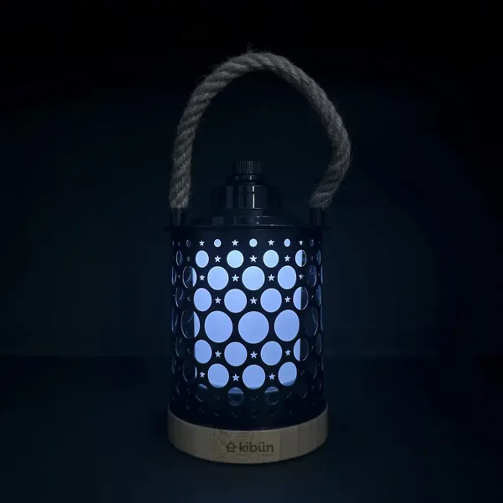 The Stargaze Cordless Outdoor Rechargeable LED Table Lamp by Bulbrite is playful and friendly, offering the appearance of a vintage tin lantern enhanced by modern technology. Designed by Kibun, a cylindrical metal shade rests on a bamboo disc base with battery storage, combined with a glass shade to surround the wet-listed LED within. The direct light is transformed into a pattern of shadow-accented shapes via the circles, crescents, and stars cut into the shade’s sides, while the rope handle offers easy transportation or suspension in outdoor environments, drawing the eye to the central knob switch at the top of the metal shade.