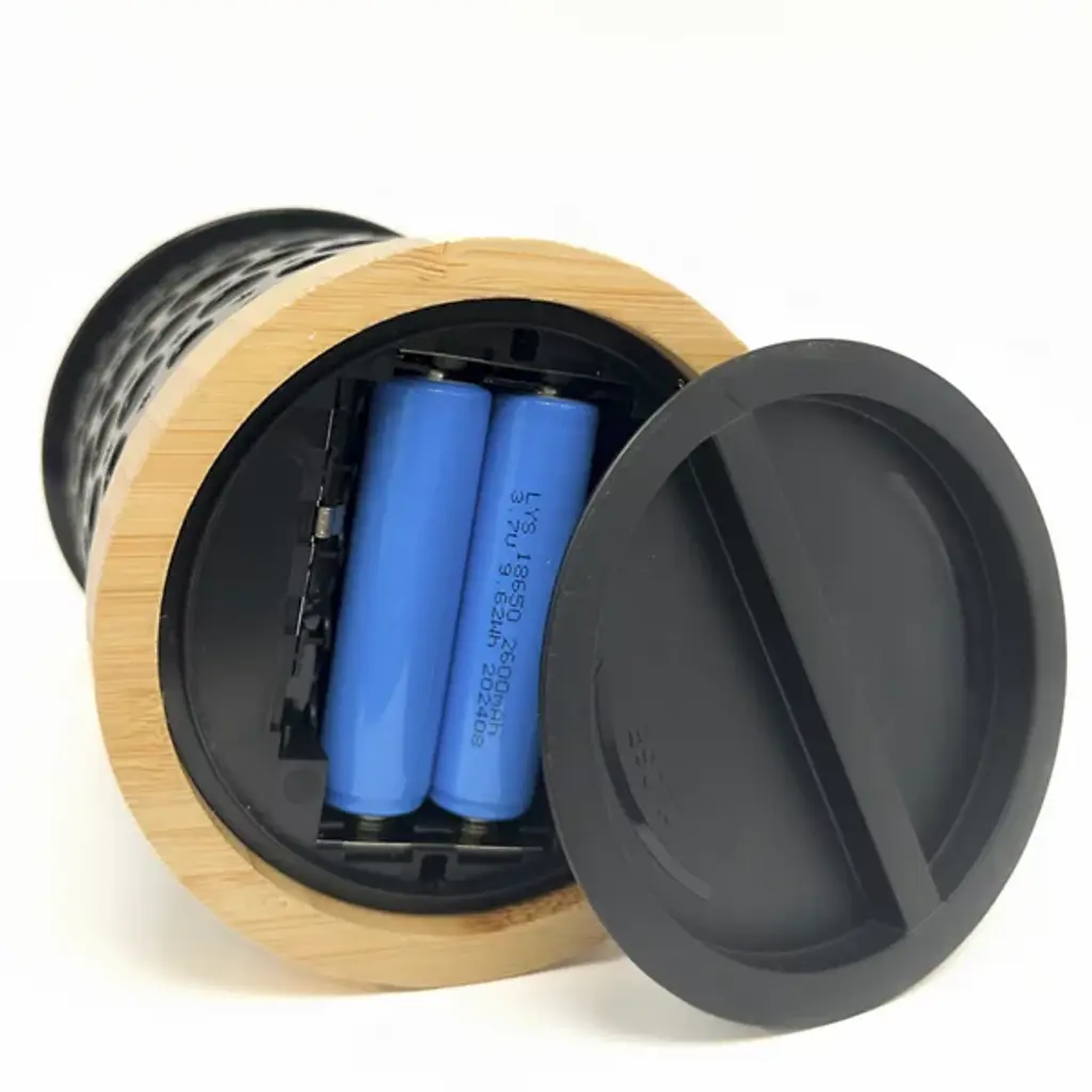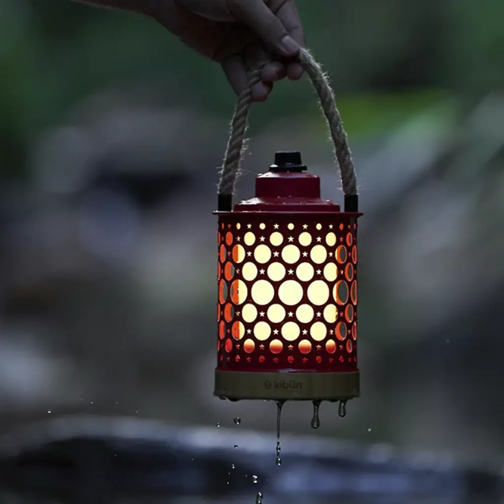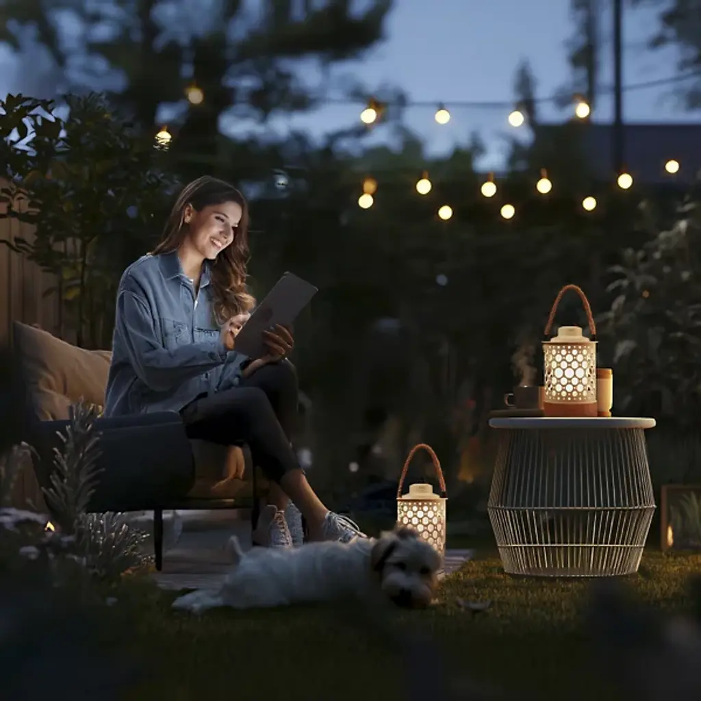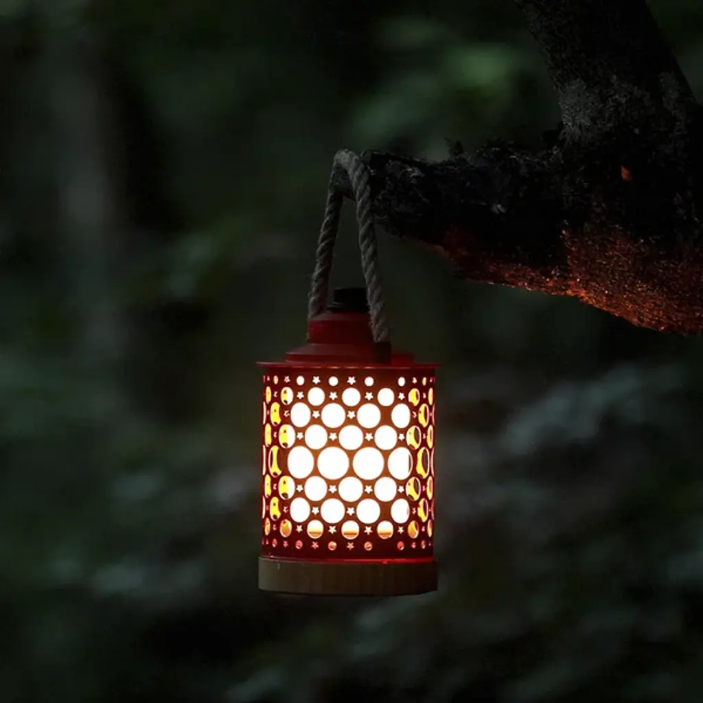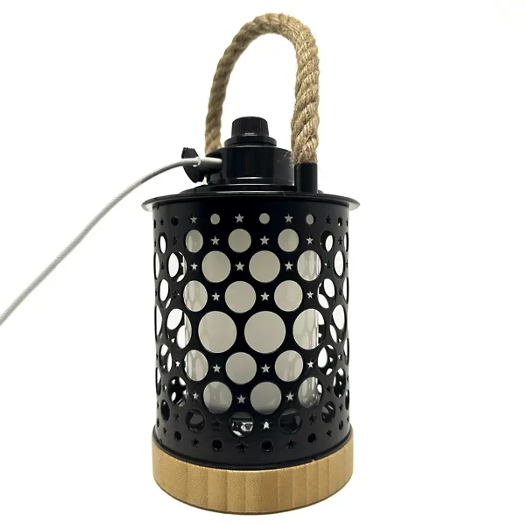 The Stargaze Cordless Outdoor Rechargeable LED Table Lamp by Bulbrite is playful and friendly, offering the appearance of a vintage tin lantern enhanced by modern technology. Designed by Kibun, a cylindrical metal shade rests on a bamboo disc base with battery storage, combined with a glass shade to surround the wet-listed LED within. The direct light is transformed into a pattern of shadow-accented shapes via the circles, crescents, and stars cut into the shade’s sides, while the rope handle offers easy transportation or suspension in outdoor environments, drawing the eye to the central knob switch at the top of the metal shade.