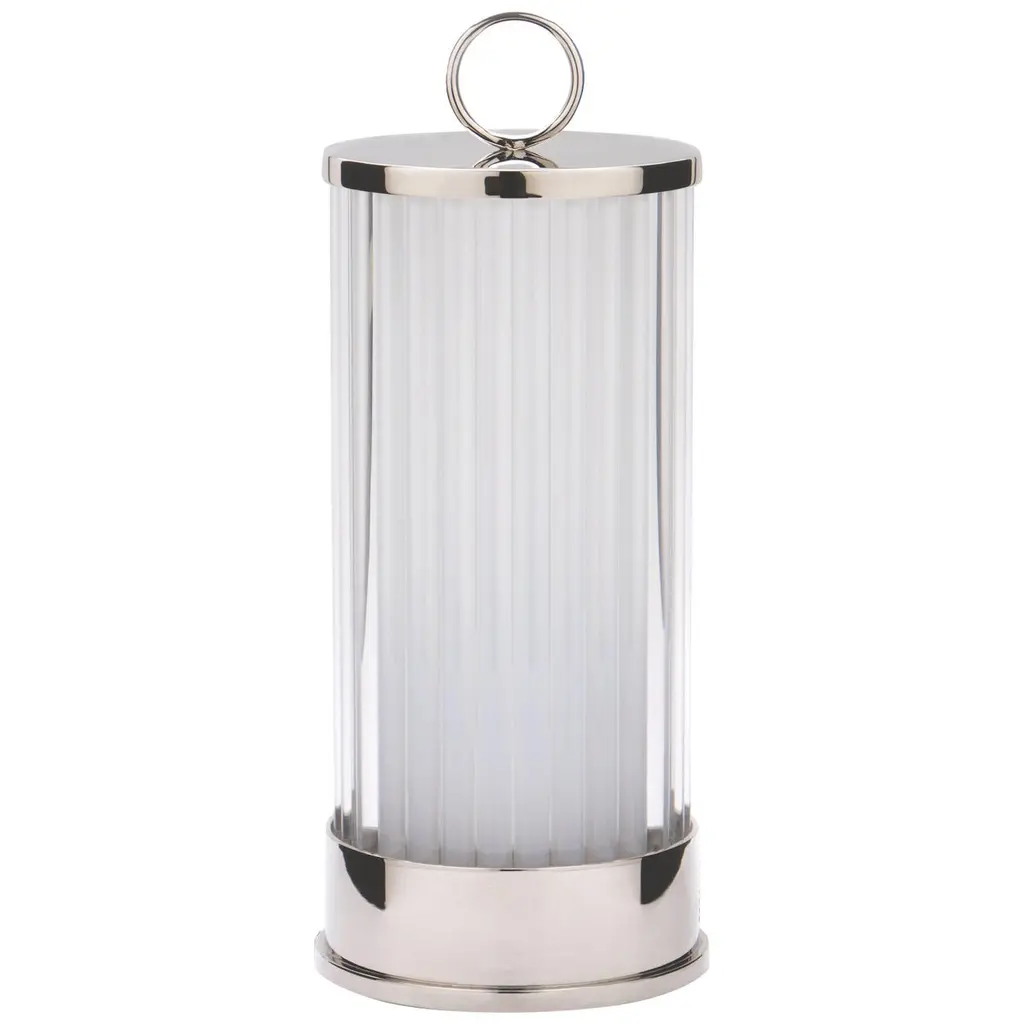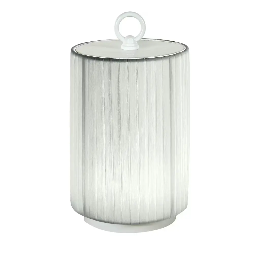 The frail beauty of parchment and the sturdy character of metal meet in this rechargeable table lamp of striking class. Featuring a square cut, the metal frame is lacquered in white and equipped with a ring at the top that allows it to be easily carried wherever desired, from indoor to outdoor settings. The light supplied by three 1.2W LED sources (7.4 rated voltage) is shaded by a white parchment diffuser. The delivery includes appropriate mains.
