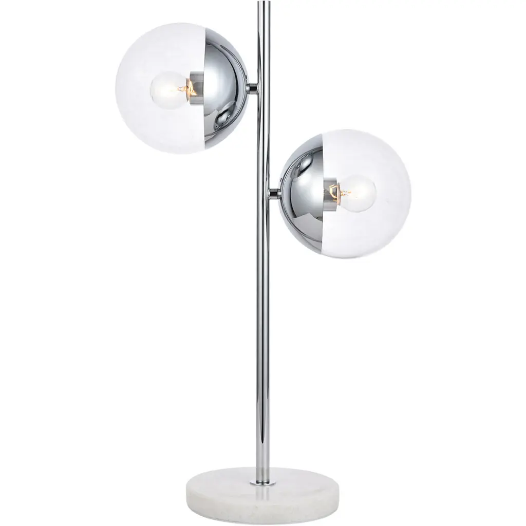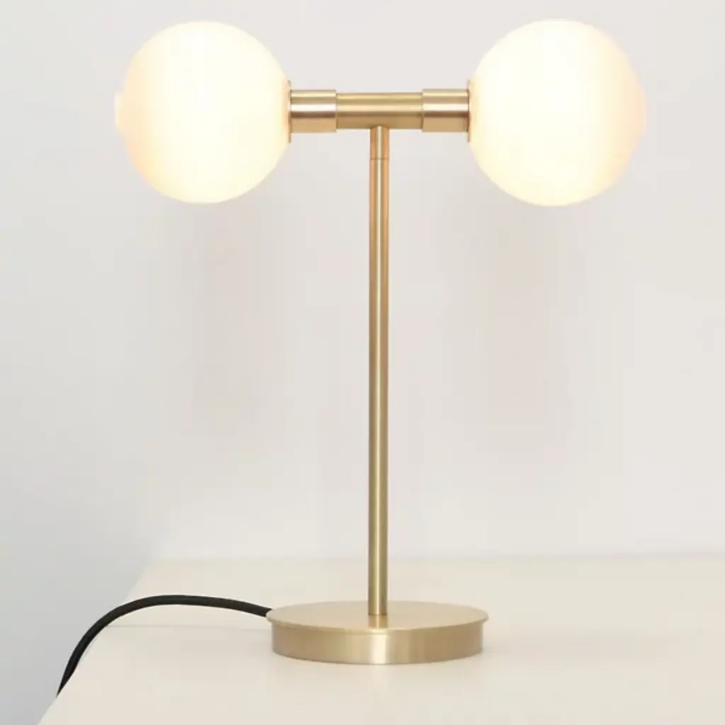 Celebrating a long-standing tradition of Czech glassmaking, the Stem 2-Light Table Lamp from SkLO pleases in its minimalist aesthetic and charms in the subtle yet unique artisanal details of its paired globe forms. At SkLO, Paul Pavlak and his wife Karen Gilbert have developed a visual language that balances restraint with surprise while championing the idea of craft. The duos art and architectural background can be seen at play in the organic shape of the globes and the sharpness of its metal construction. Made in brass, clean geometric hardware leads the eye up at a twin stem. Double dipped blown glass spheres made in the Czech Republic with a traditional process delight in their forms and surprise in the unique character of their fire glazed mouths. Bulbs inside bring to light the artisan’s marks while radiating out in a heartfelt ambient glow.