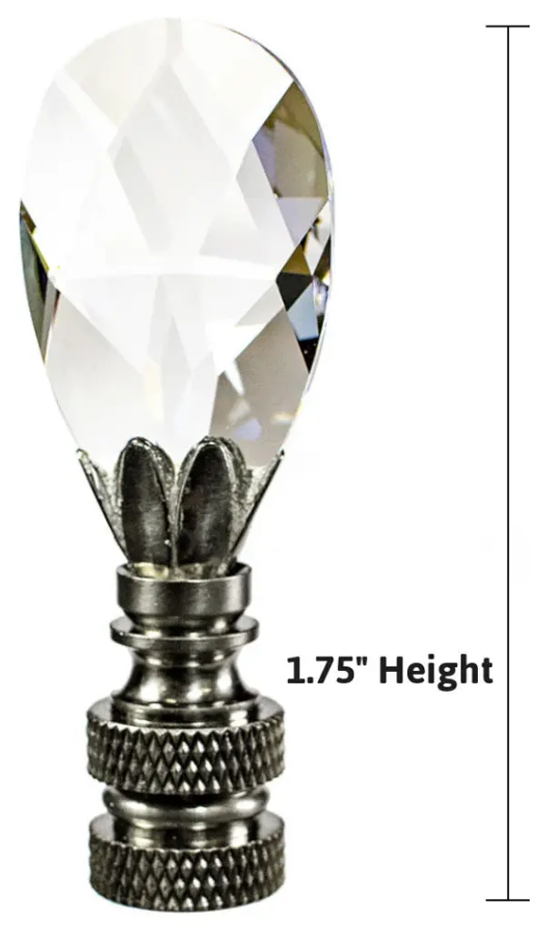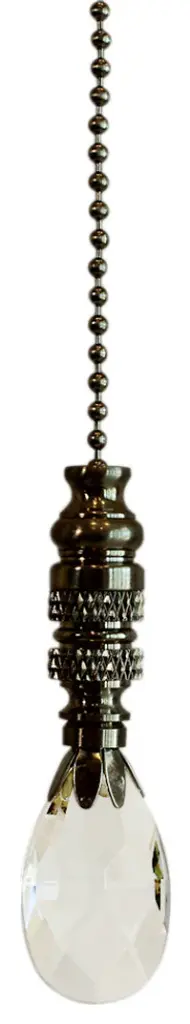 A new ceiling fan pull is the perfect way to complete your new or favorite ceiling fan. Quality fan pull that is sure to dress up your tired ceiling fan. All Home Concept fan pulls have a protective lacquer coating to prevent tarnishing or discoloration. Fan pull has a beaded metal chain, compatible with most ceiling fans. Chain measures 12" length (and can be cut shorter), 2.75" height and 1.5" width. Fan pull measures25" height and 1" width. Material: Genuine Stephanov Crystal with Brushed Nickel Metal Chain.SMALL TEARDROP SHAPE - 2.5" height x 1" width Small Teardrop lamp finial with a 12" chain. A perfect Crystal accent to customize your ceiling fan.GENUINE STEPHANOV CRYSTAL FINISH - Crystal Accent will draw attention with its multi-facets.PERFECT SIZE - Proportional sized to fit most standard ceiling fans. Finial measures 2.5" Height and 1" width. Threaded at 1/4" wide opening, threaded for standard 27 threads per inch.FUNCTIONAL - Extends your ceiling fan on/off switch and upgrades its style.EASY TO USE - Simple snap the chain into your existing ball-chain connector on your fan. 12" ball chain can be cut shorter if desired.