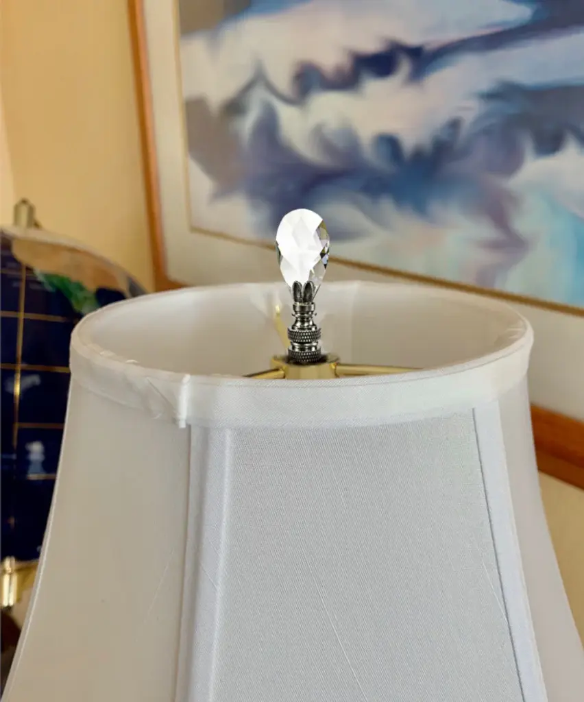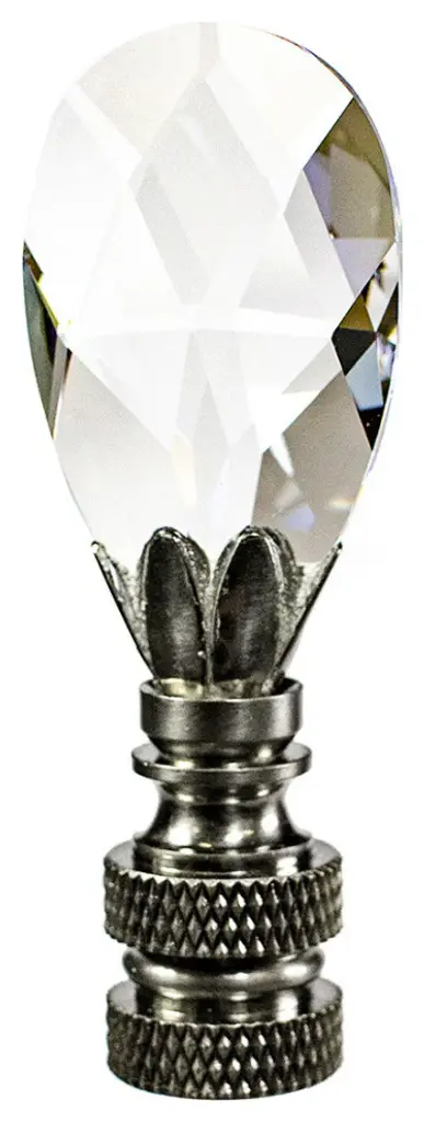 A new lamp finial is the perfect way to complete your new or favorite lamp. Quality finial that is sure to dress up your tired lamp. Finials have a standard 1/4"-27 thread, which will fit the harp on almost every lamp. (This means the opening is 1/4" wide and there are 27 threads per inch.) 95% of all lamp harps will fit this finial. Finial measures 2.5" Height and 1" width. Material: Genuine Stephanov Crystal with Brushed Nickel Base.Small Teardrop SHAPE - 1" width Small Teardrop lamp finial. A perfect Crystal accent to top off your table or floor lamp.Genuine Stephanov Crystal with BRUSHED NICKEL FINISH - Crystal Accent will draw attention with its multi-facets.PERFECT SIZE - Proportional sized to fit most standard table or floor lamps. Finial measures 2.25" Height and 1" width. Threaded at 1/4" wide opening, threaded for standard 27 threads per inch.FUNCTIONAL - Secures your lampshade to standard table or floor lamp.EASY TO USE - Easily screws on/off. Fits standard lamp harps that measure 1/4" wide with 27 threads per inch.