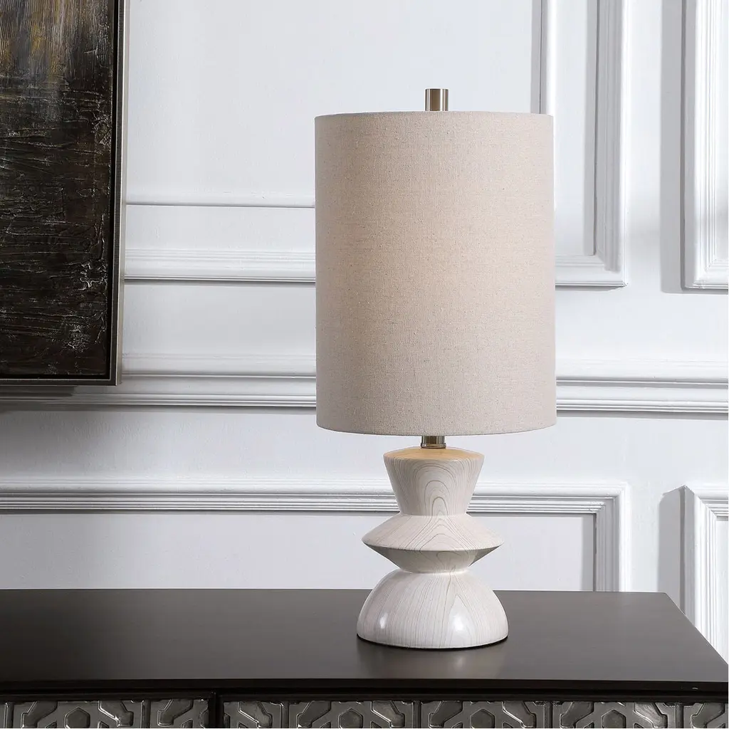 A Nod To Classic Mid-century Styling, This Buffet Lamp Has A Geometric Shaped Base With A Bleached Wood Tone Look, Accented By Brushed Nickel Plated Details. A Light Beige Fabric Shade Accents The Piece.