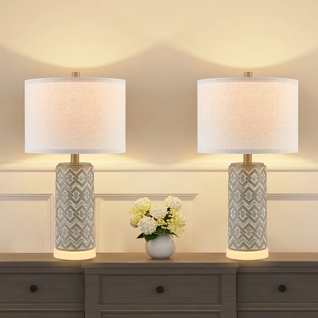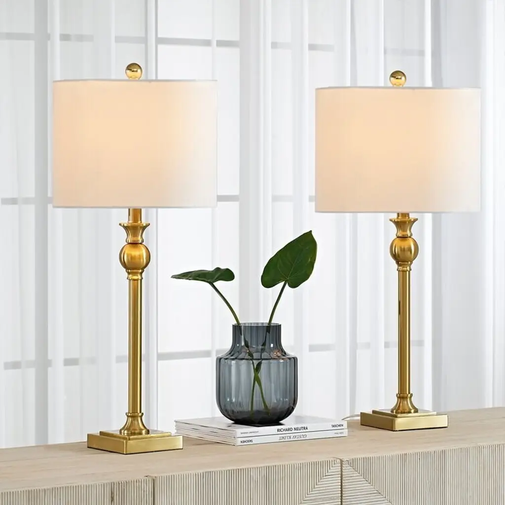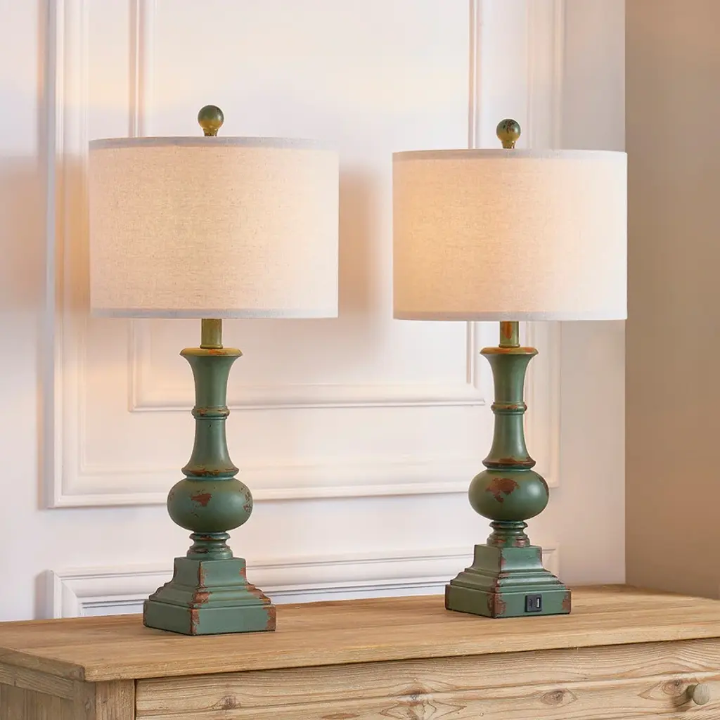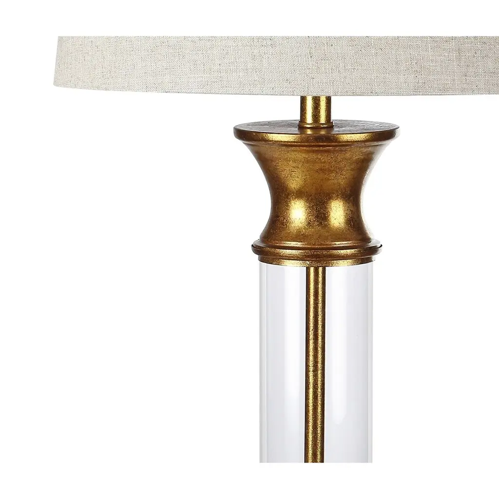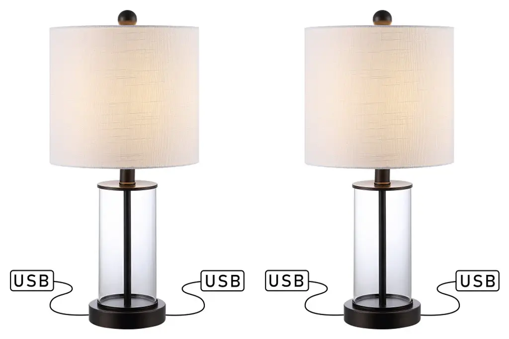 Inspired by antique candlesticks, this glass and metal base evokes classic elegance with modern functionality. The cord is wrapped with silk, in the traditional style, but the wiring accommodates any standard 100-watt bulb, including LED. A gray cotton drum shade finishes the look. Features:Dimensions:About us:You see a lamp.We see a decorative work of art.A perfectly curved shade casts a dramatic shadow on a floor. A silk cord you never want to hide. Compatible with LED lightbulbs: as easy on the environment as they are on the eyes. The JONATHAN Y Lighting collection considers every detail from impeccably sourced materials to designer styling. And our prices are so attractive, we've transformed a functional necessity into a fashion accessory.JONATHAN Y Lighting - a fashion revolution in home decor.