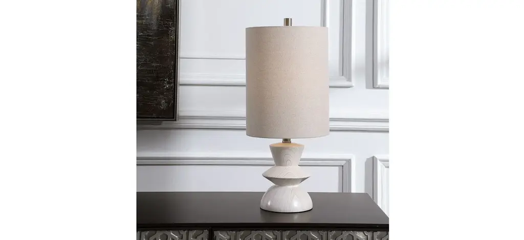A nod to classic mid-century styling, this buffet lamp has a geometric shaped base with a bleached wood tone look, accented by brushed nickel plated details. A light beige fabric shade accents the piece.