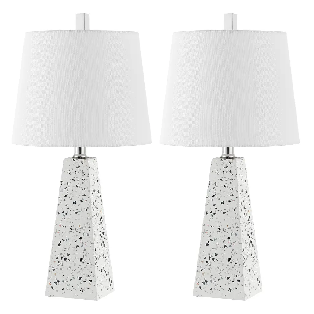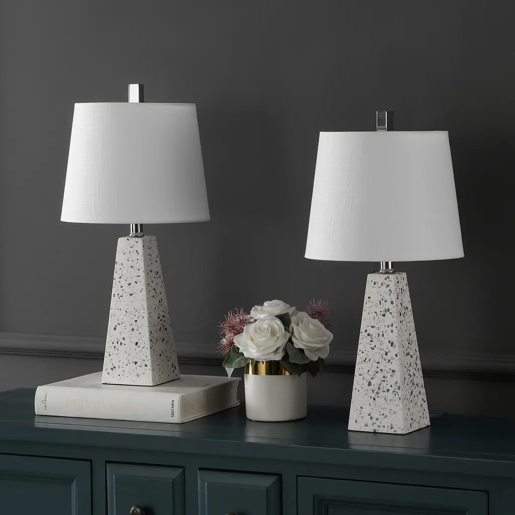 Modern and eye catching, this chic table lamp features an elegant resin base in mixed shades of white and gray to create the effect of marble, but without the inconsistencies inherent in natural stone. This lux finish, coupled with the geometric faceted pyramid silhouette, evokes a modern interpretation of a neoclassical design. The white fabric shade diffuses soft light into any living space, in contrast to the geometric edges of the lower design and the lamp is topped with a matching marbleized resin finial.Features:Dimensions:About us:You see a lamp.We see a decorative work of art.A perfectly curved shade casts a dramatic shadow on a floor. Compatible with LED lightbulbs: as easy on the environment as they are on the eyes. The JONATHAN Y Lighting collection considers every detail from impeccably sourced materials to designer styling. And our prices are so attractive, we've transformed a functional necessity into a fashion accessory.JONATHAN Y Lighting - a fashion revolution in home decor.