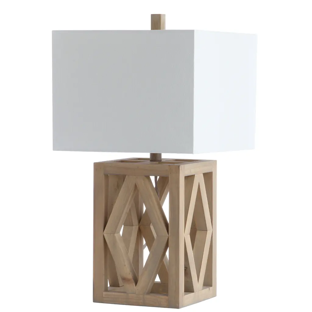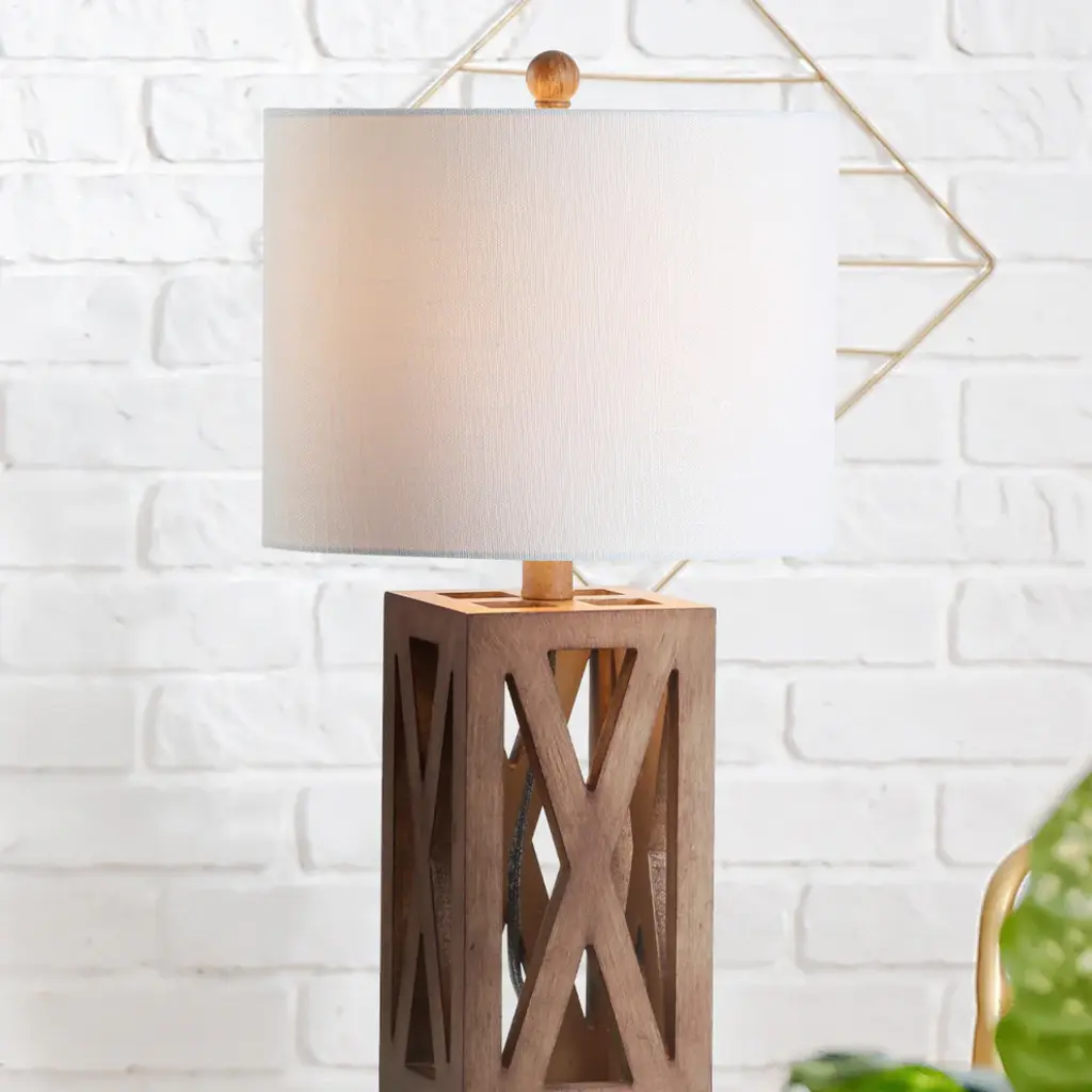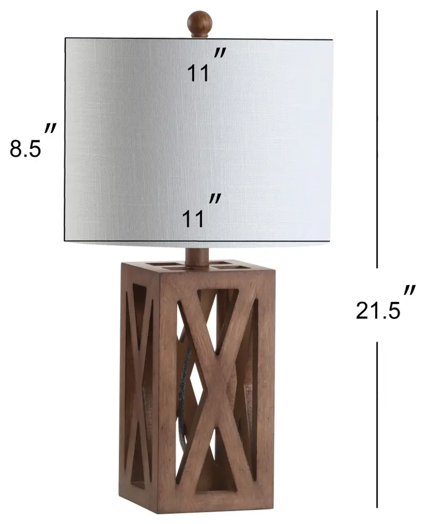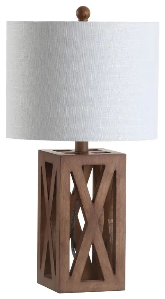 This gorgeous wooden lamp has an earthy texture and a geometric open structure that would easily blend with traditional, rustic, or contemporary decor. Designers love the silk-wrapped cord, linen drum shade, and wooden finial. At 21.5" high, it would sit perfectly atop a desk, armoire, or side table.Features:• 100% cotton hardback drum shade in white• 60" black/silver silk cord with standard USA 2-prong plug• On-off rotary switch on socket• Eco-friendly 4W LED bulb included• Takes one bulb and compatible with any 9W LED or 40W TYPE "A" or 13W CFL• Color: Brown with white shade• Body Material: Wood• Includes: One (1) lamp(s)• Assembly RequiredDimensions:• Lamp: 21.5 inches high x 11 inches wide x 11 inches deepAbout us:You see a lamp.We see a decorative work of art.A perfectly curved shade casts a dramatic shadow on a floor. A silk cord you never want to hide. LED lightbulbs: as easy on the environment as they are on the eyes. The JONATHAN Y Lighting collection considers every detail from impeccably sourced materials to designer styling. And our prices are so attractive, we''ve transformed a functional necessity into a fashion accessory.JONATHAN Y Lighting - a fashion revolution in home decor.