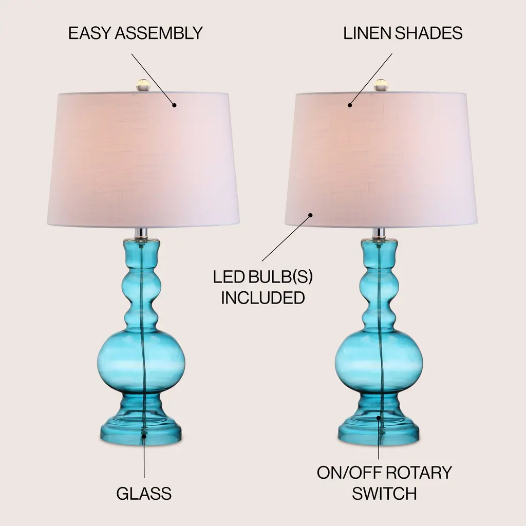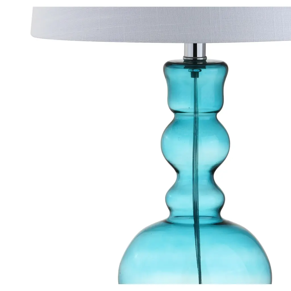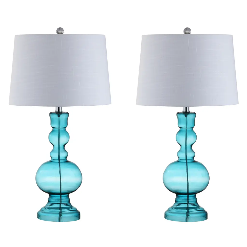 Bookend a shelf or console with an eye-catching pair of these beautiful blown-glass table lamps. The vibrantly hued glass bodies are gently curved, and the crisp white shades finish these lamps in classic style. A statement-making aqua hue makes this set of two the perfect pair for infusing color into your home decor. Features:Dimensions:About us:You see a lamp.We see a decorative work of art.A perfectly curved shade casts a dramatic shadow on a floor. A silk cord you never want to hide. LED lightbulbs: as easy on the environment as they are on the eyes. The JONATHAN Y Lighting collection considers every detail from impeccably sourced materials to designer styling. And our prices are so attractive, we've transformed a functional necessity into a fashion accessory.JONATHAN Y Lighting - a fashion revolution in home decor.